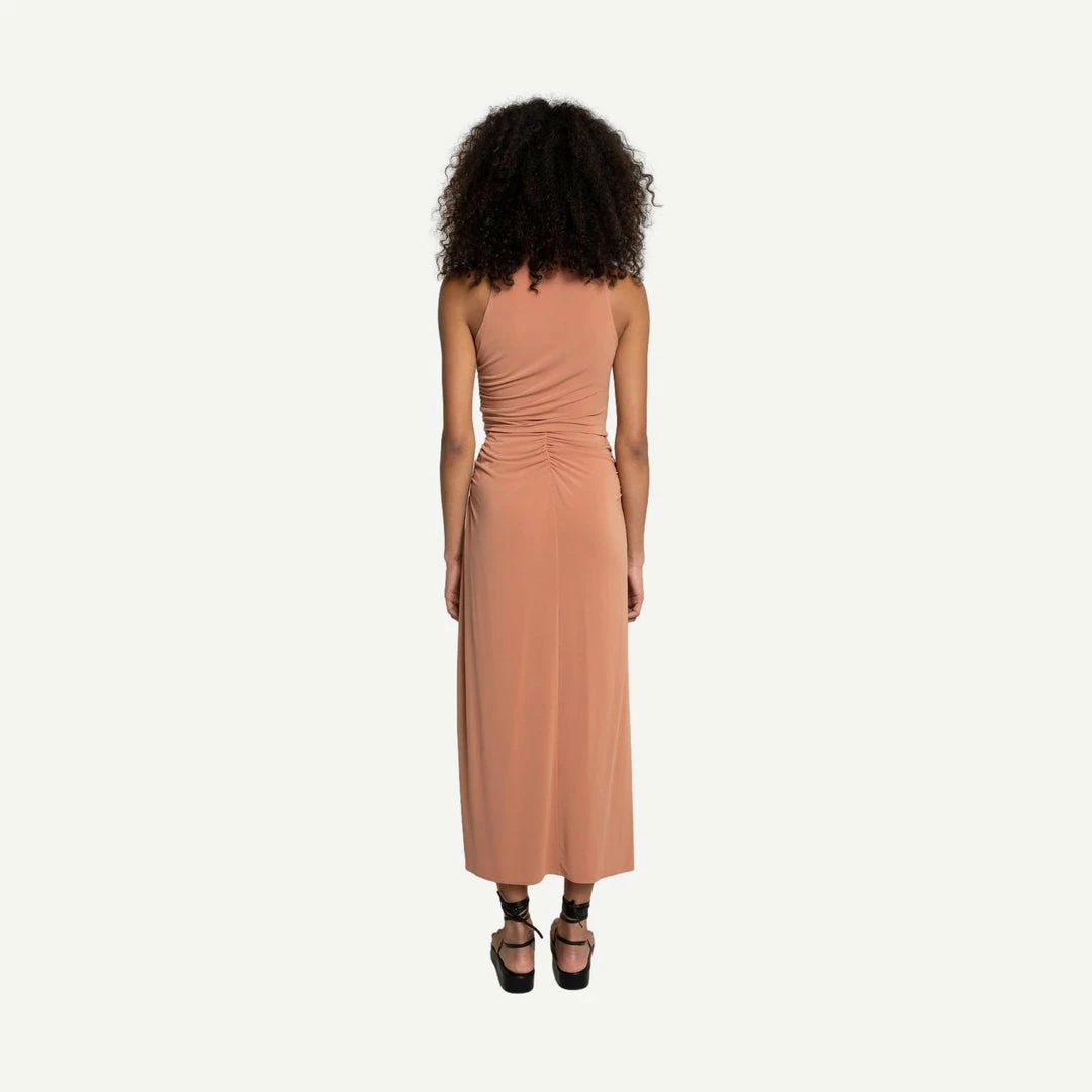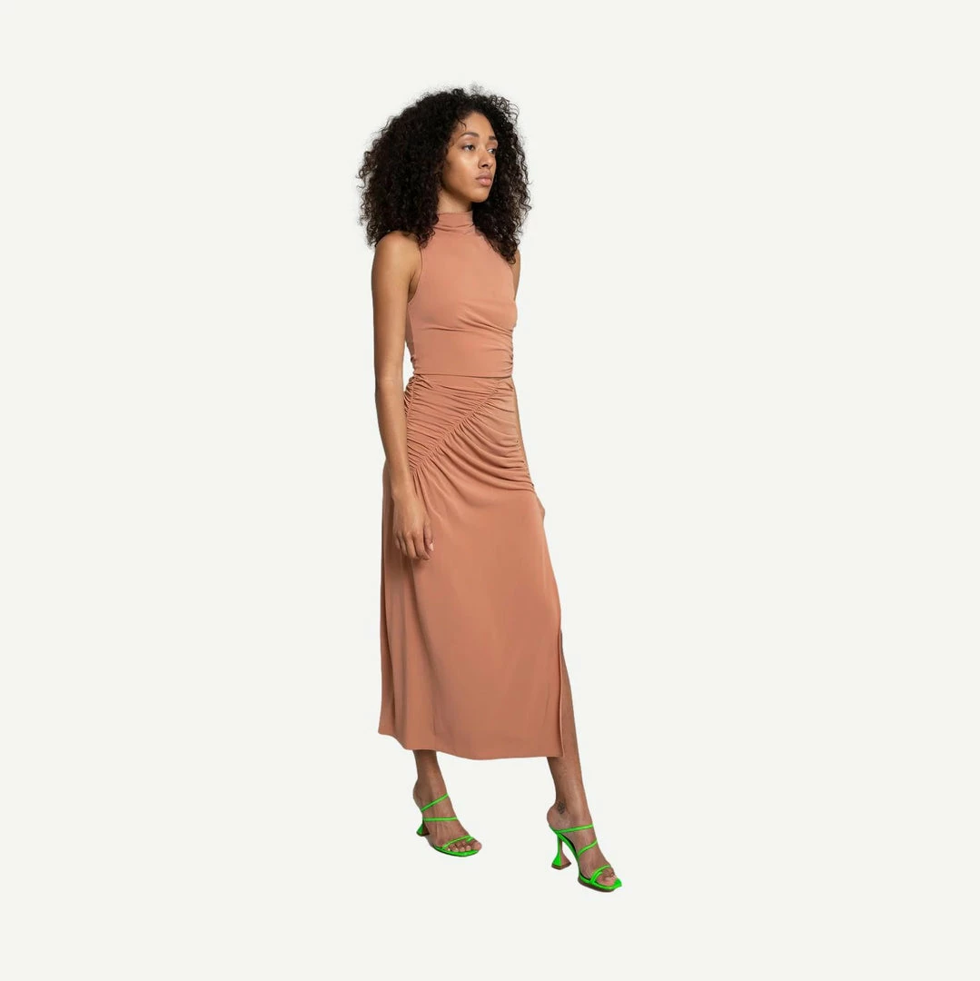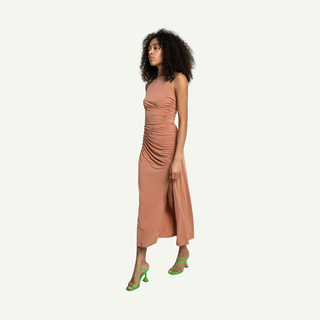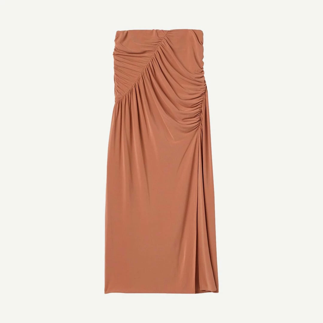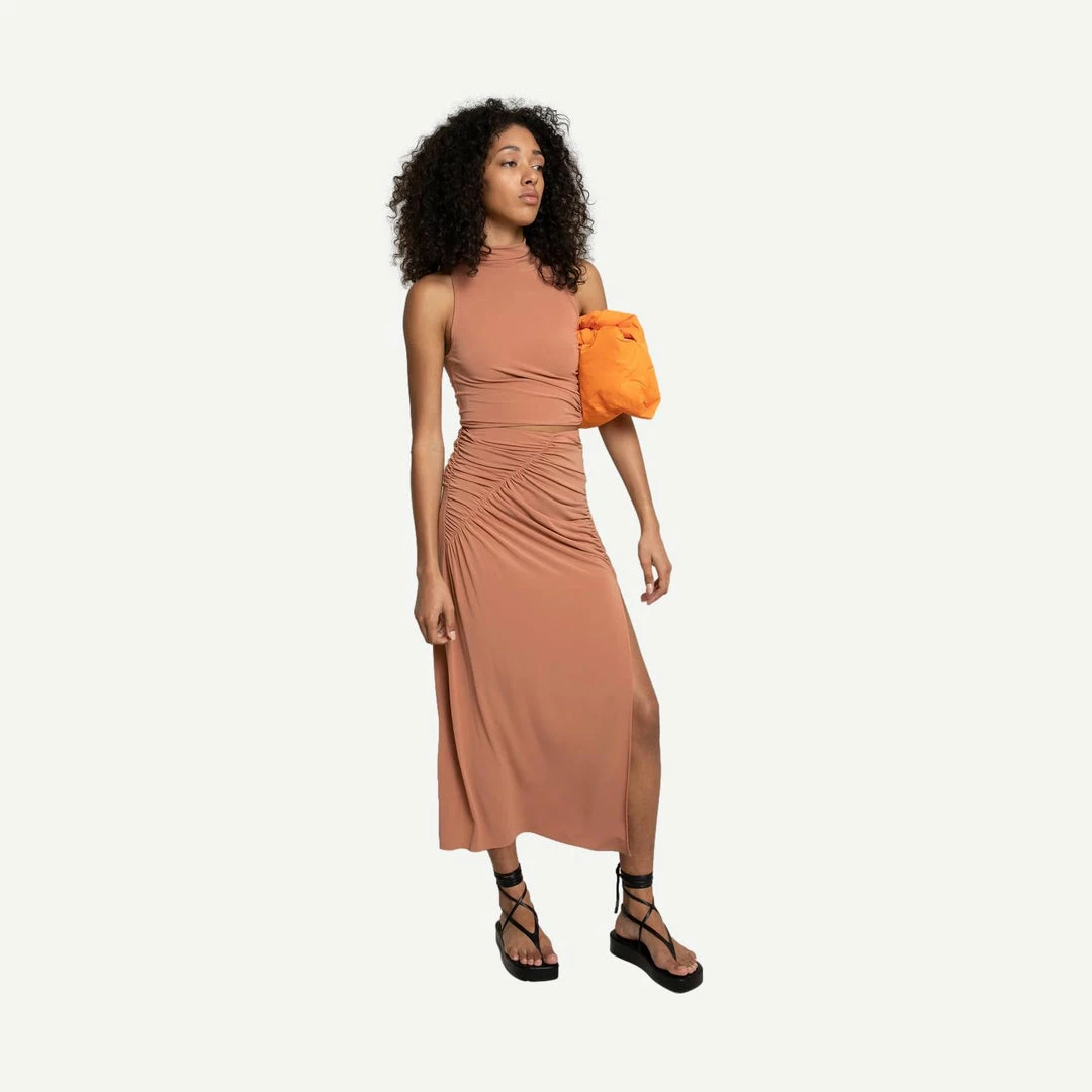 The Dawson Skirt is crafted from a crepe jersey blend rosy rust hue. This midi silhouette features asymmetric ruching for a body-skimming fit.