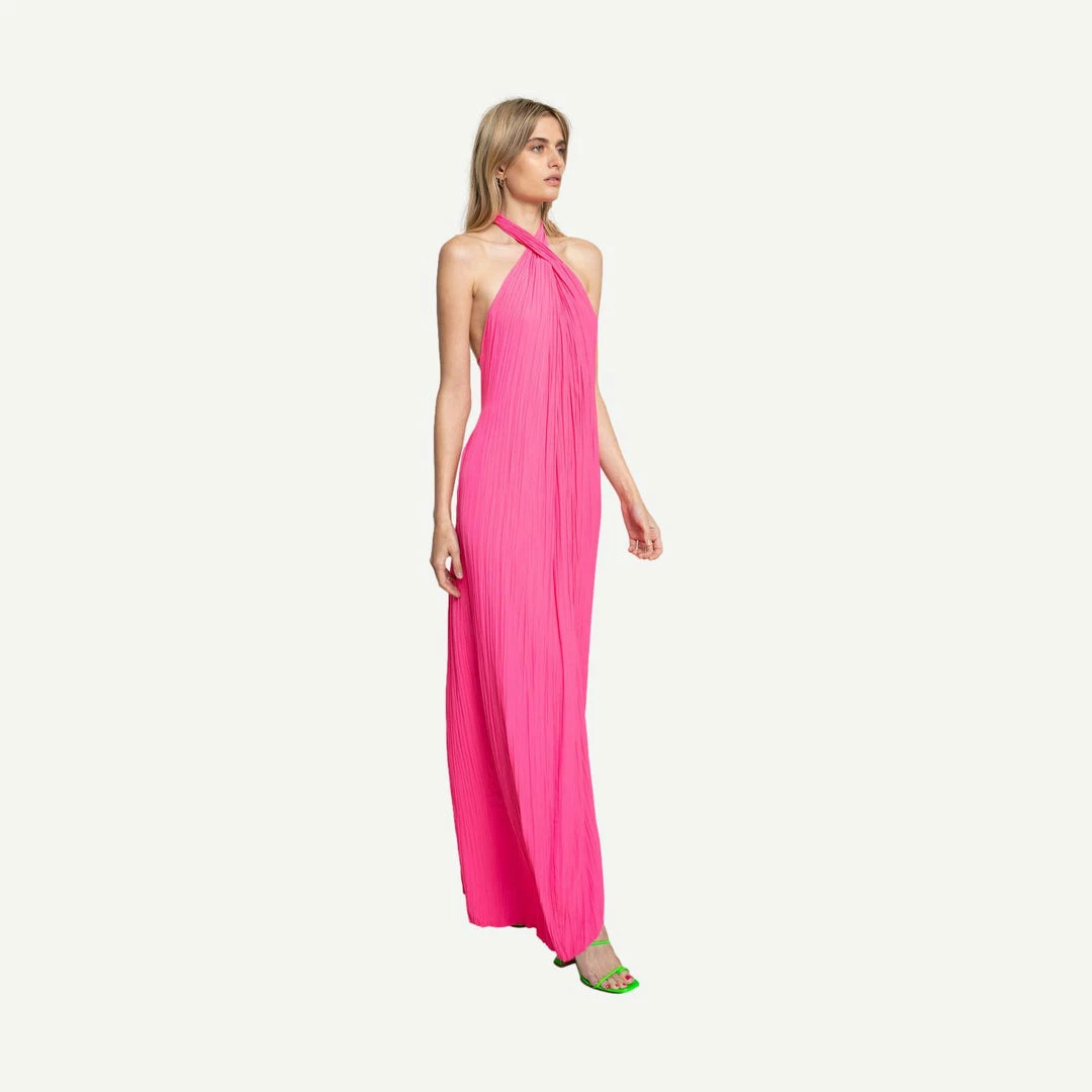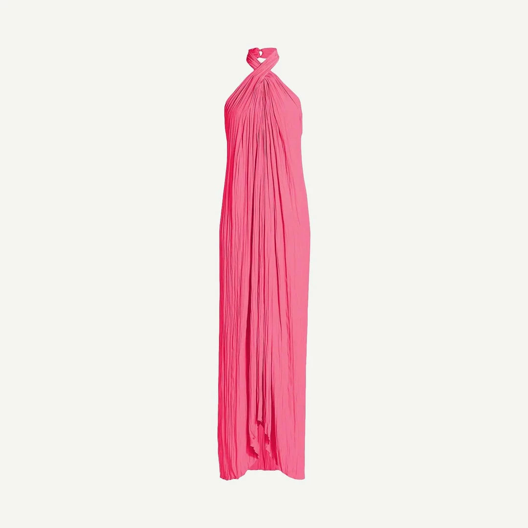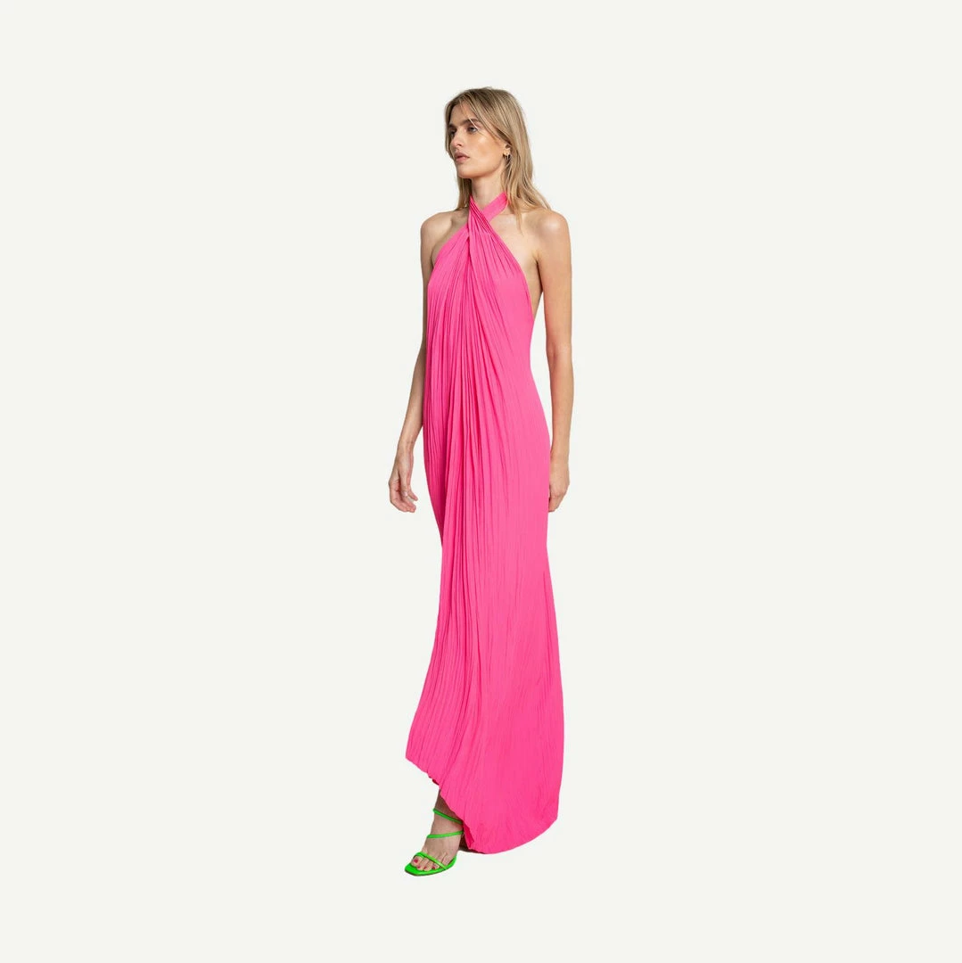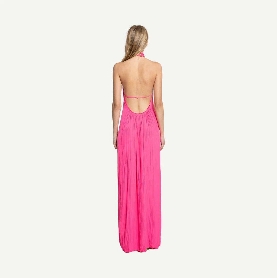 The Rio Dress is crafted in a viscose-nylon blend in bright orange. This minimalist silhouette, designed to hit at the knee, features a notched high neckline a sporty cutout back.