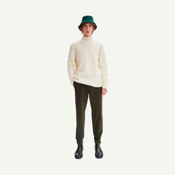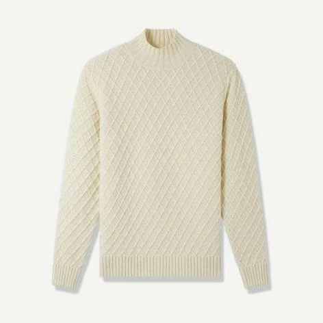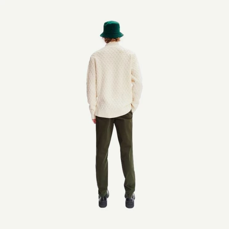 For this end of season, the French label offers us a sweater in merino and cashmere made from Italian yarns. Both warm and soft, this piece is inspired by the argyle pattern, which is found in relief on the sweater. We find on its high collar, it’s neckline, it’s bottom of sleeve and body, a ribbed 2 / 2.