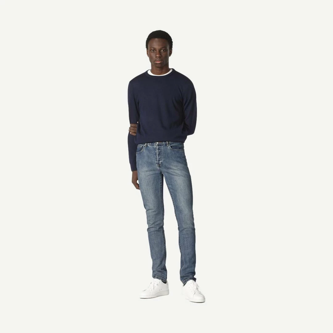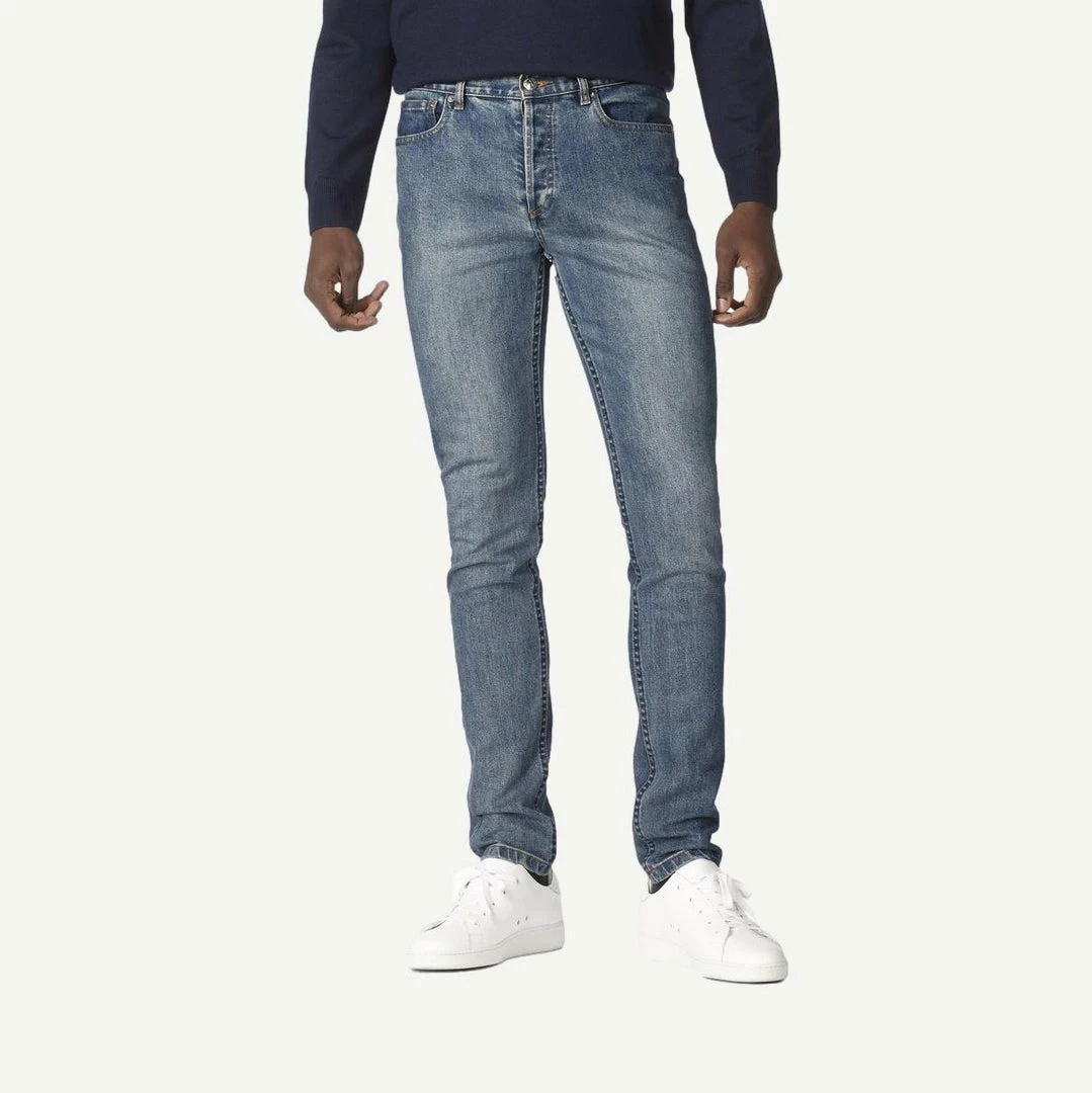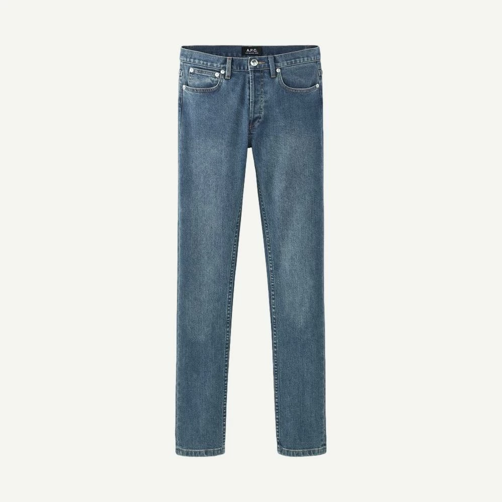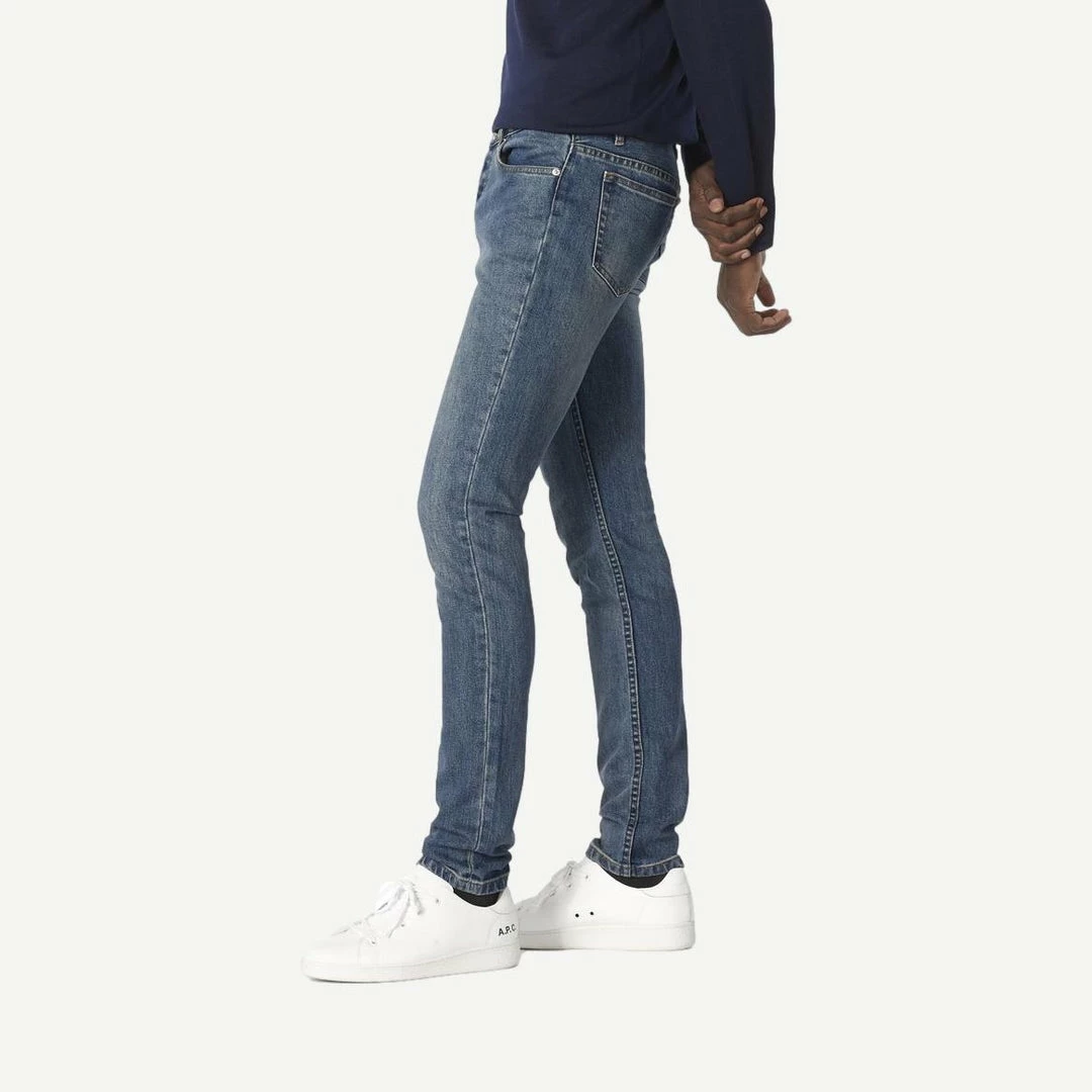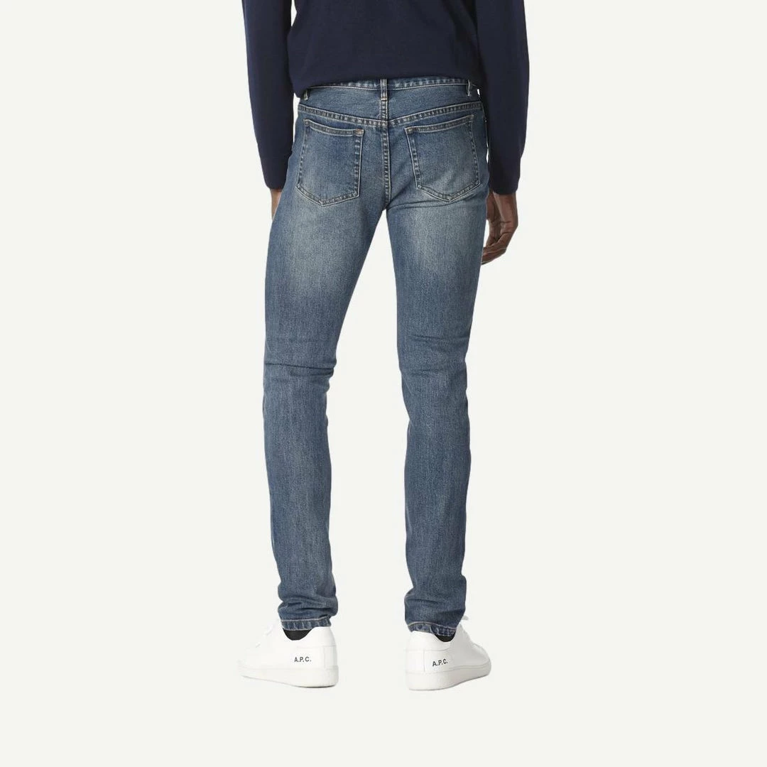 Stonewashed Japanese stretch denim. Very tight leg fitted at the bottom. Straight mid-rise. Five pockets, button fly. The first button is engraved “A.P.C. rue Madame près du Luxembourg”. Orange topstitching.