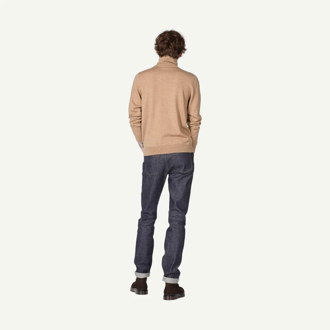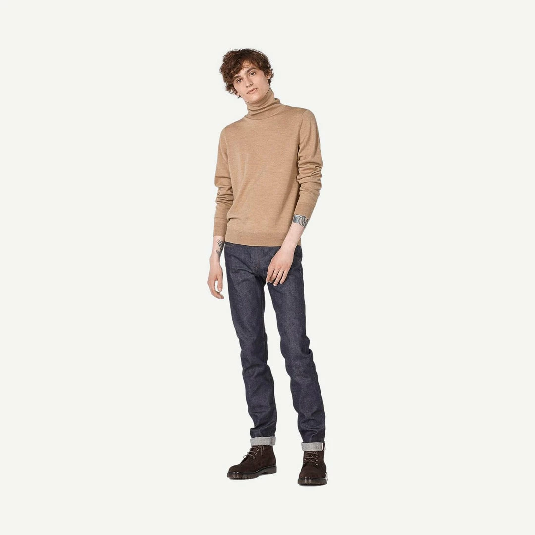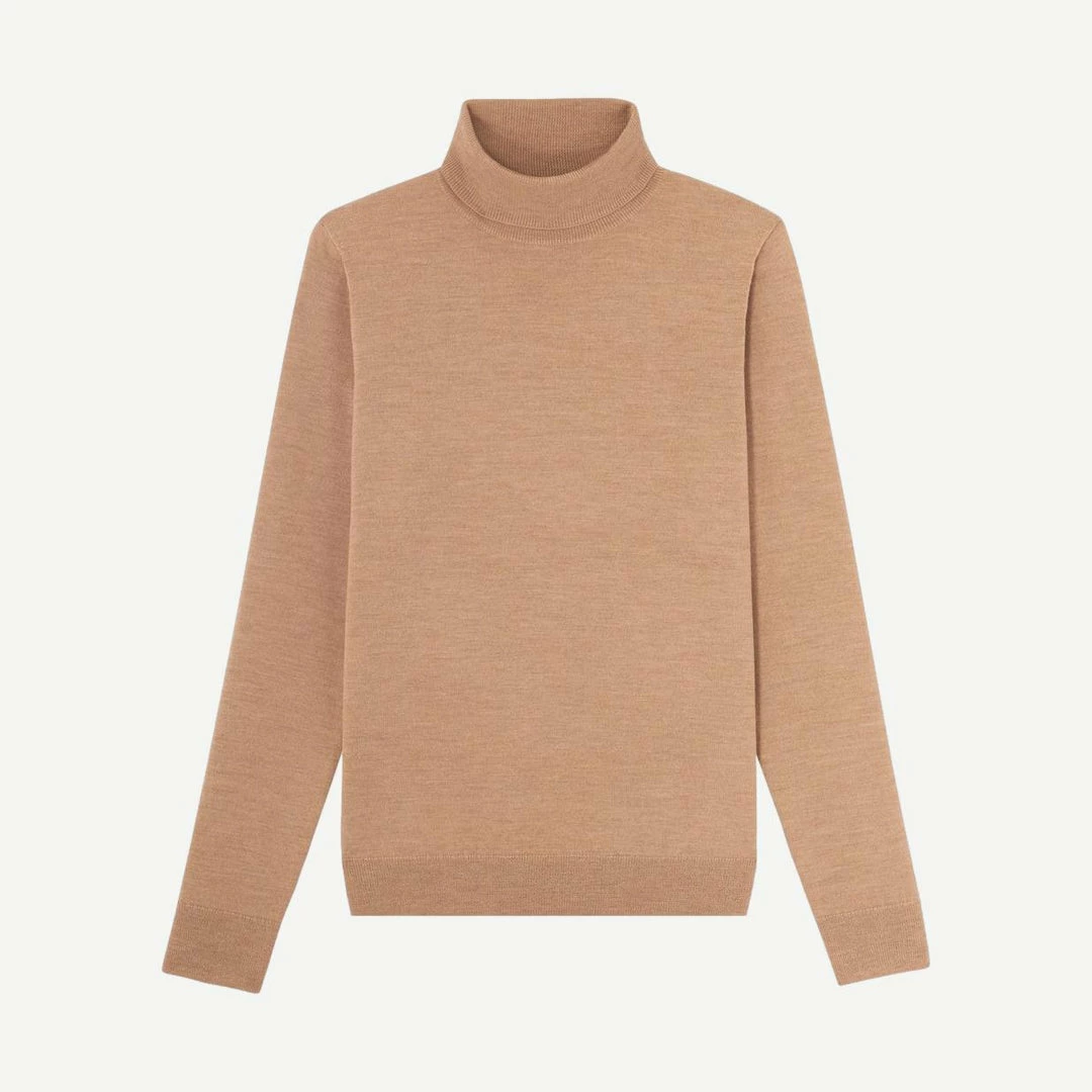 Classic Merino wool. Italian yarn and production. Stocking stitch. Very soft, biodegradable material. Straight silhouette. Turtleneck collar. Set-in sleeves. Elasticated ribbing at wrist and hem.
