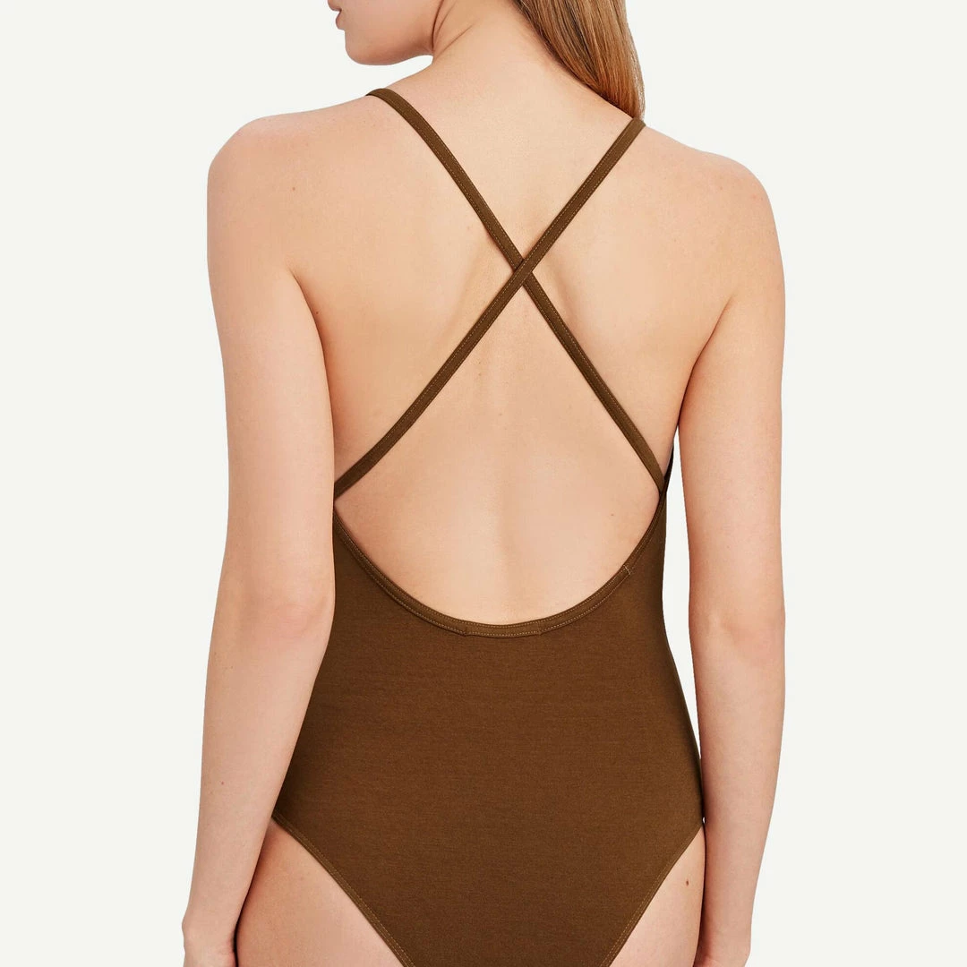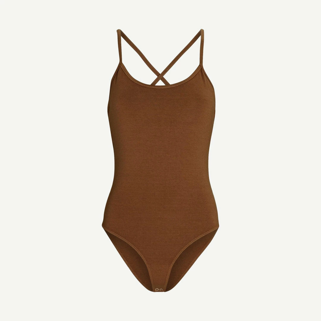Finished with crossed back straps, AGOLDE’s Dhalia cami bodysuit is a sleek underlayer in their Caramel brown jersey. Snap bottom closures.