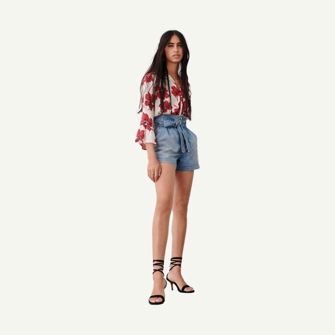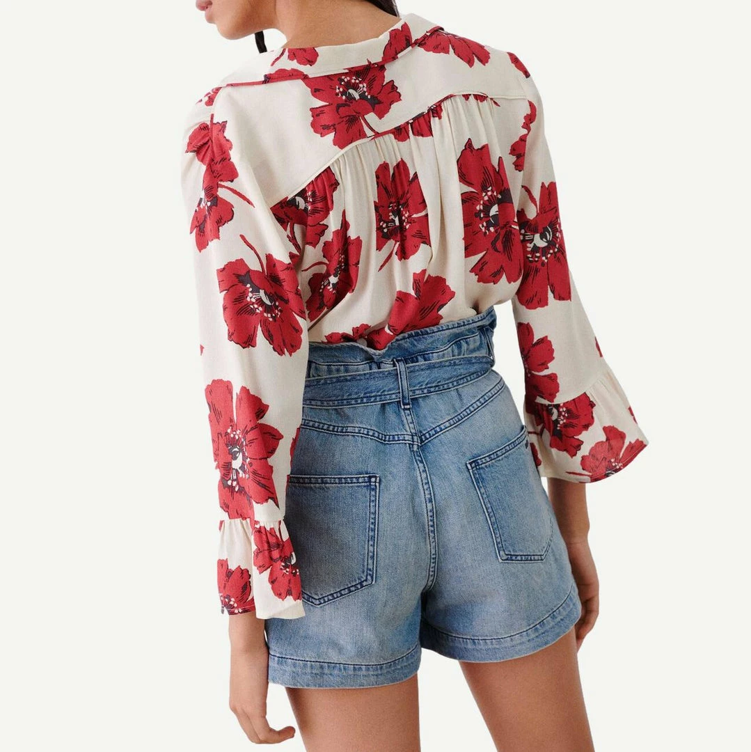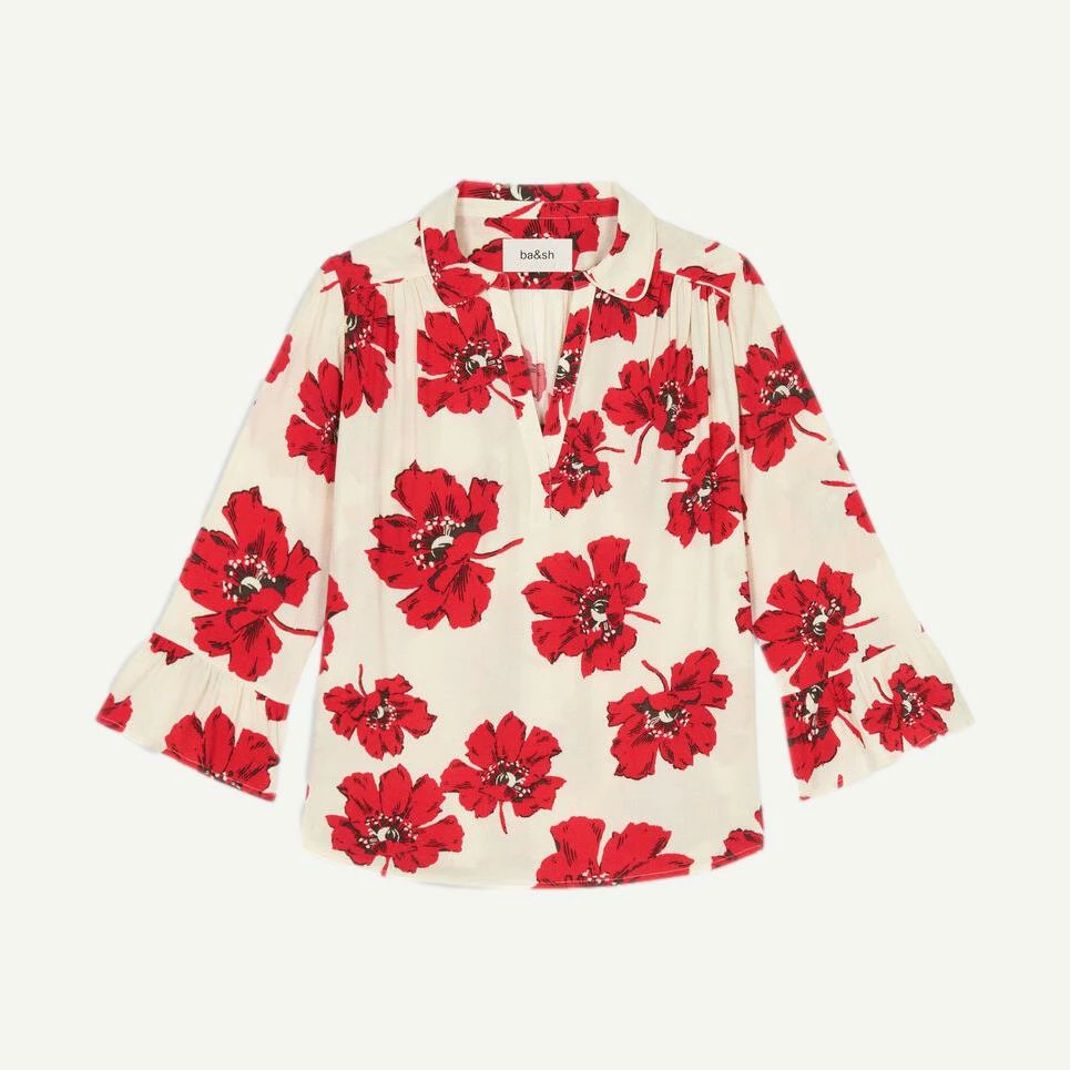 The ba&sh KEDDY blouse is seductively soft and feminine. The top has a polo-shirt collar which extends to a V-shape and short button placket and ruffled 3/4-length sleeves that evoke medieval style. It is cut in a flowing fabric enhanced with large colorful flowers. Take note of the meticulous gathered finish from the shoulder yoke and the delightful piping. A gorgeous and very ladylike blouse.