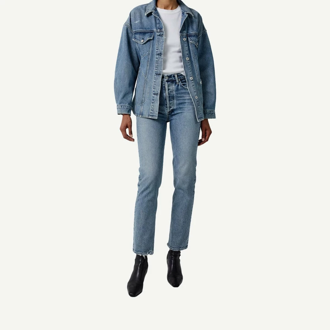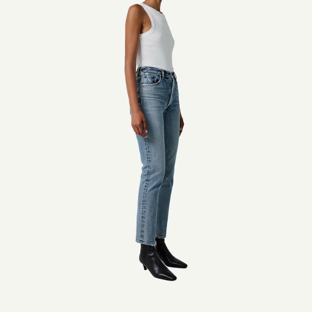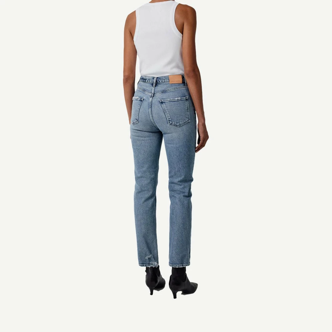 Inspired by the best of vintage. The Sabine has a high rise with a fitted feel through the waist and hip. The leg shape is straight with a bit of ease.