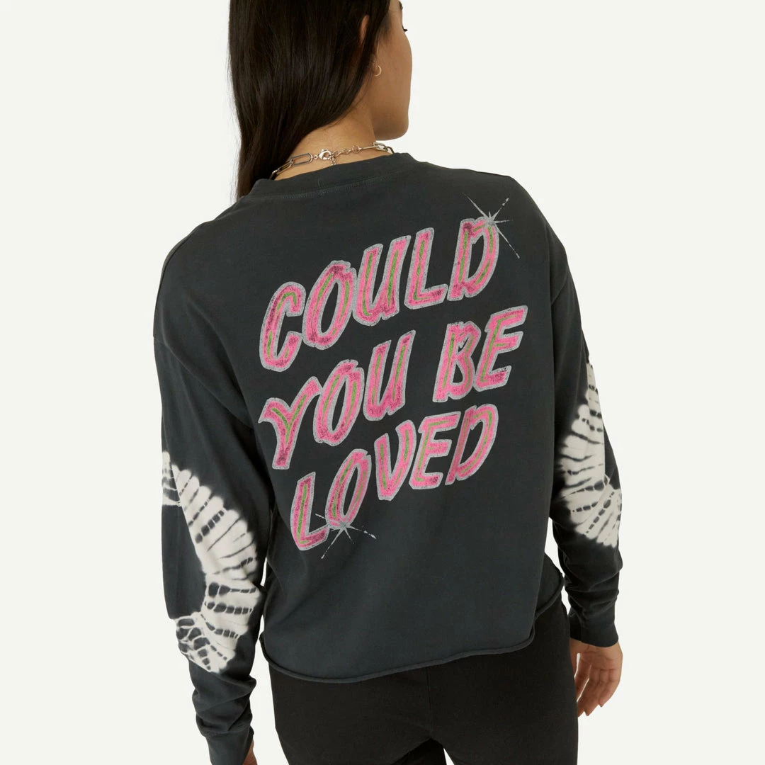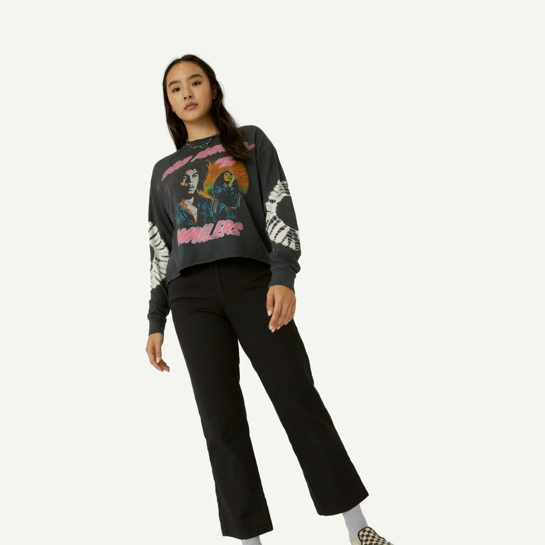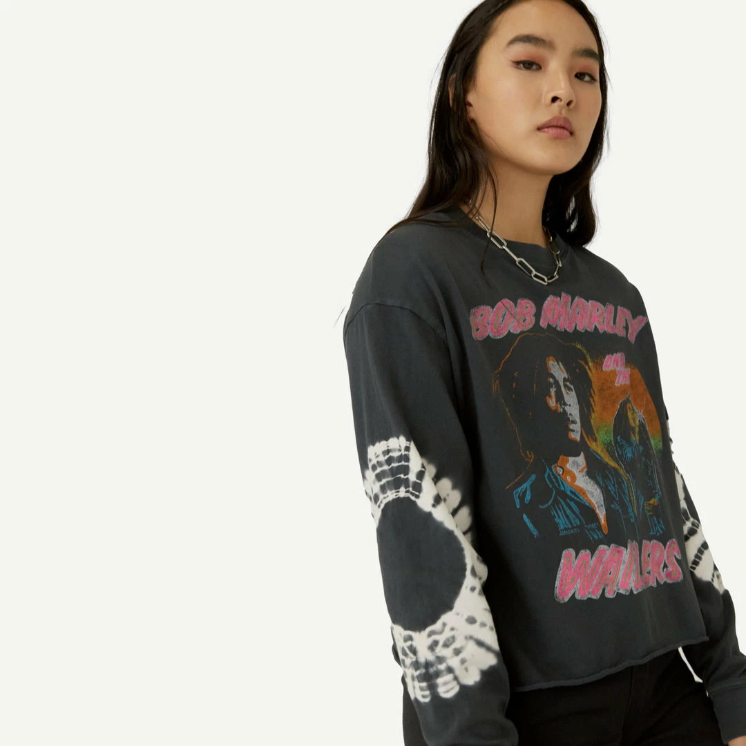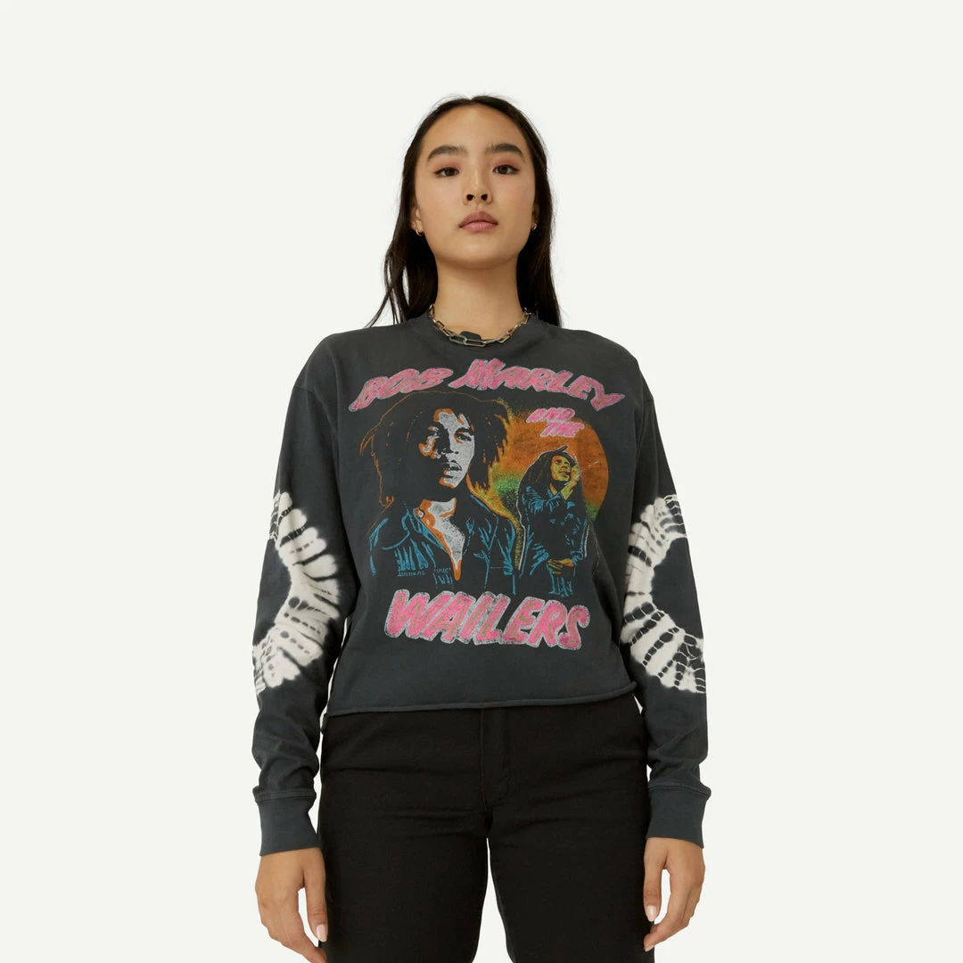 Go easy in this relaxed fit long sleeve crop featuring the pioneer of reggae and forever symbol of peace, love, justice and harmony. Bob Marley and the Wailers’ greatest hit “Could You Be Loved” inspired this bleached out black arrival with a reggae colored portrait of the icon center chest and his lyrics stamped on the back. Accented with tie dye sleeves that are sure to be loved.