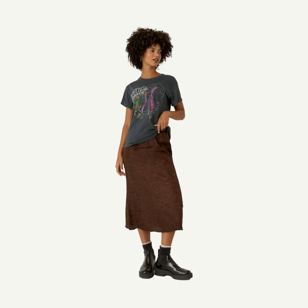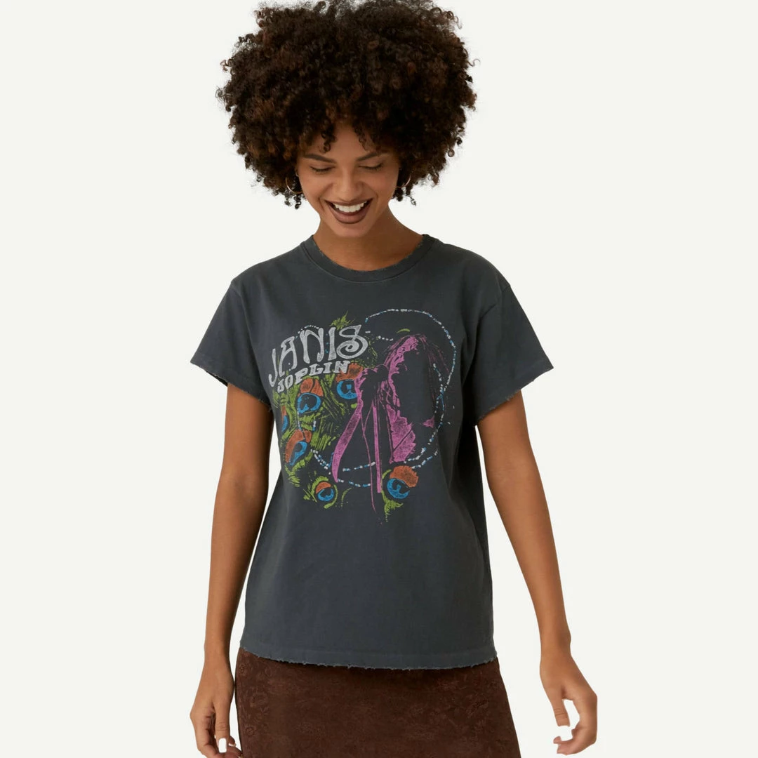 The woman of rock-and-roll known for her peacock-like, psychedelic fashion featuring numerous colored boas takes center on this vintage black tour tee. Designed with peacock feathers and a scan of the icon whose whimsical clothing matched her musical style. Accented with Janis Joplin’s name in silver and light distressing on the neckline and hems.