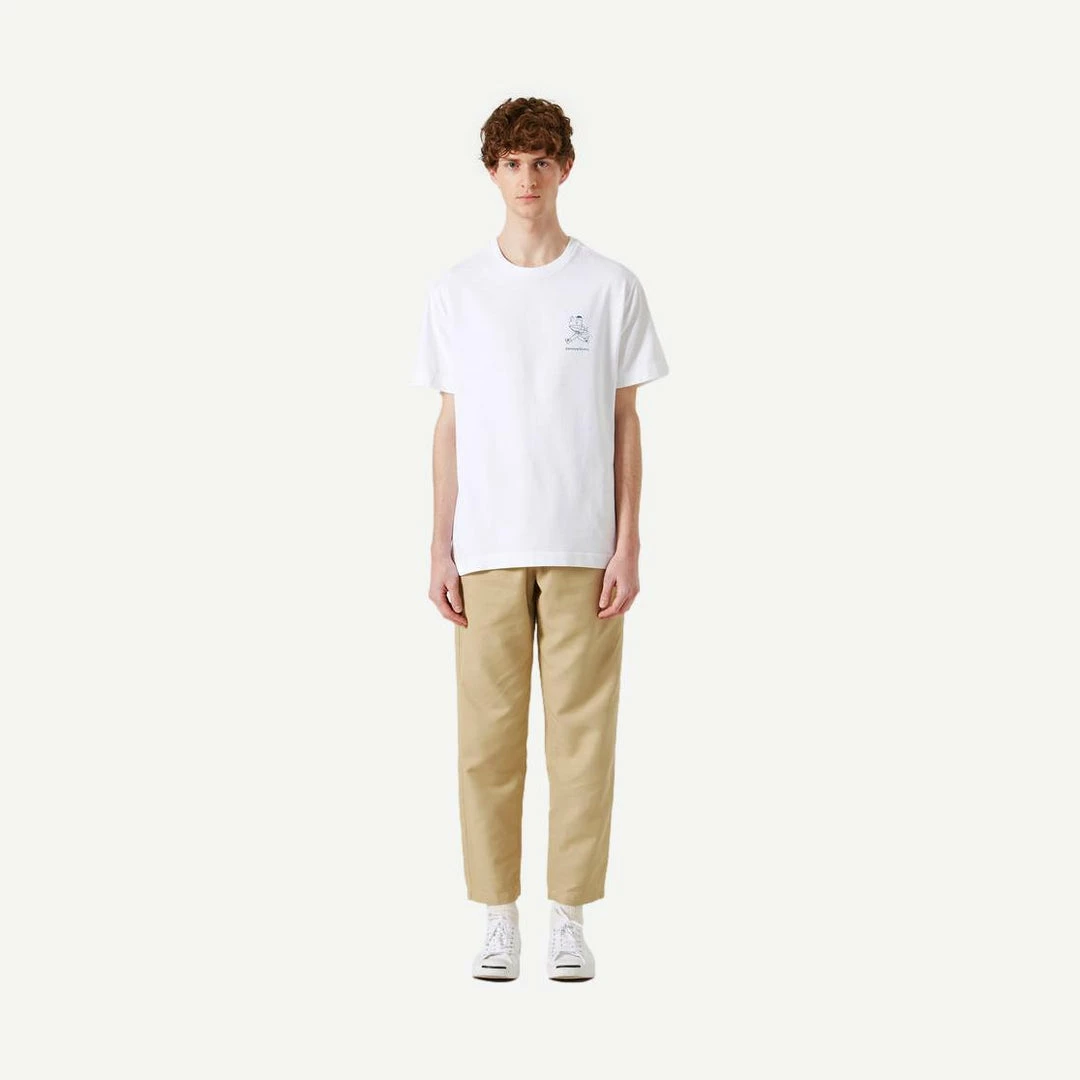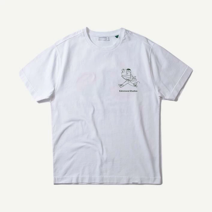 Pure white T-shirt. Made of 100% cotton, with classic cut short sleeves with double stitching. Round ribbed collar. With a small illustration on the front, on the upper left side and a large illustration on the back in black and white, surfer style.