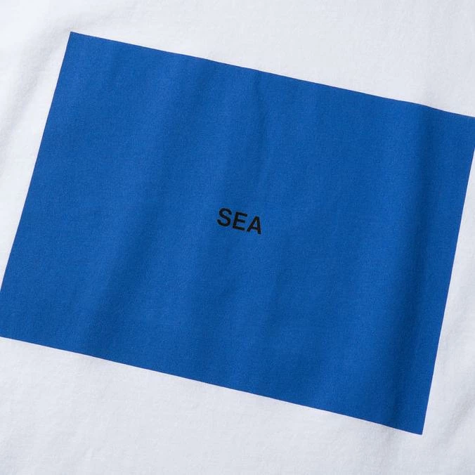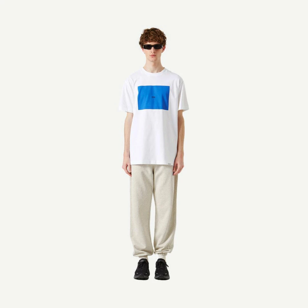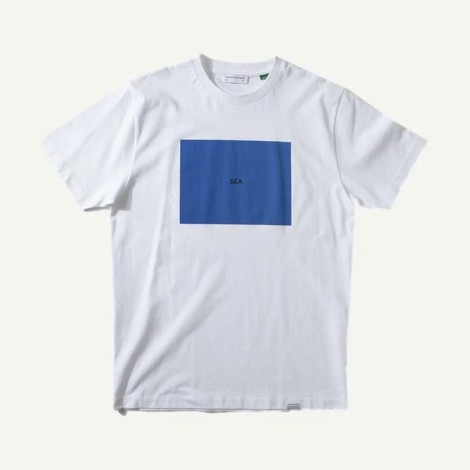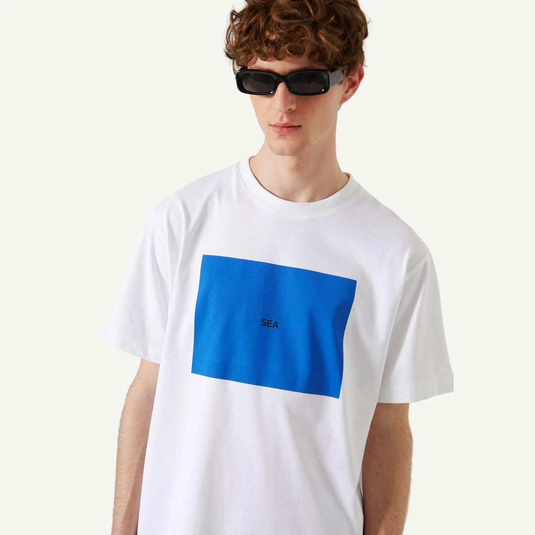 T-shirt with round neck and short sleeves, in white. In the center of the chest it shows a blue square with the message “SEA”. Made of high quality organic cotton.
