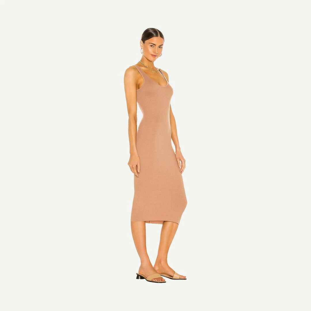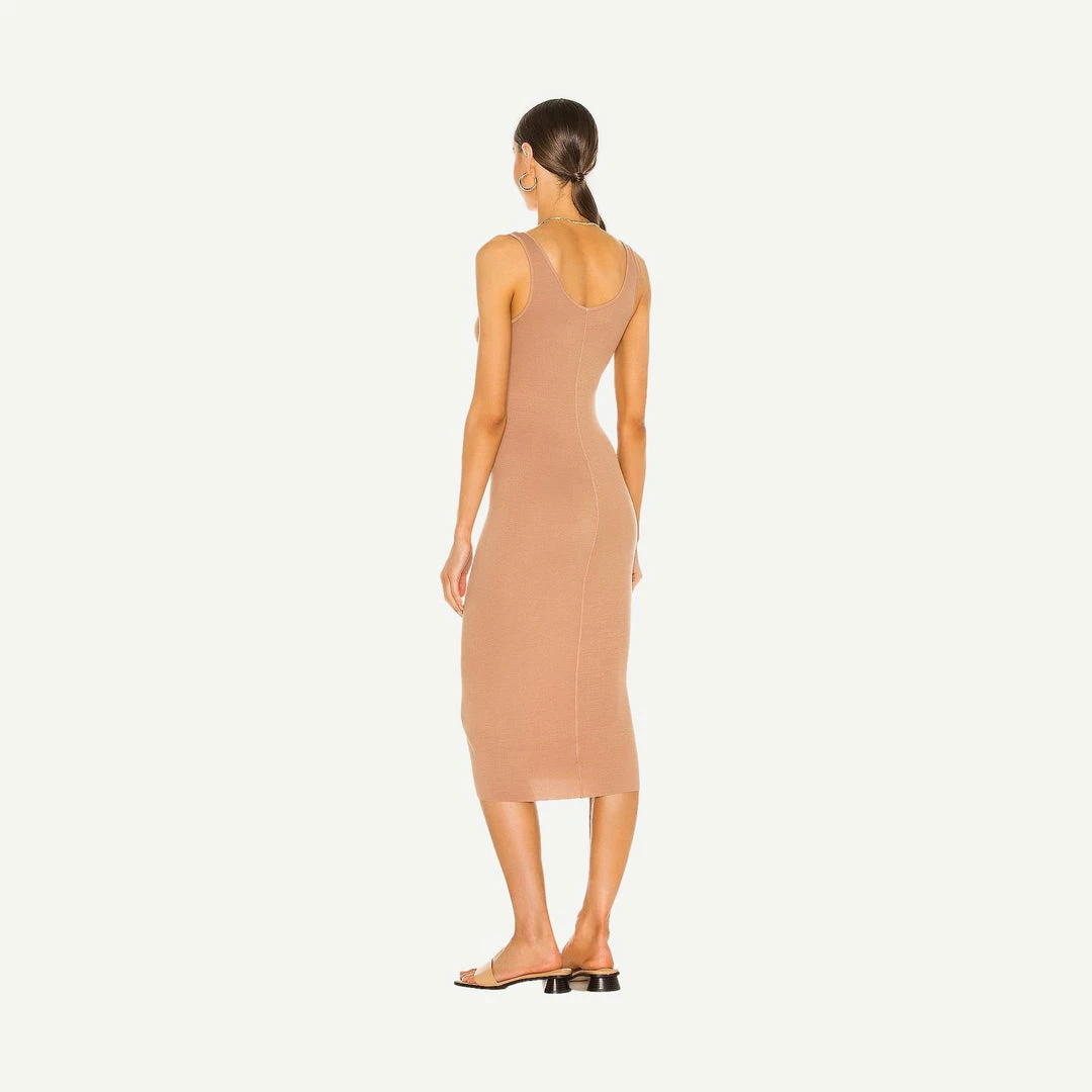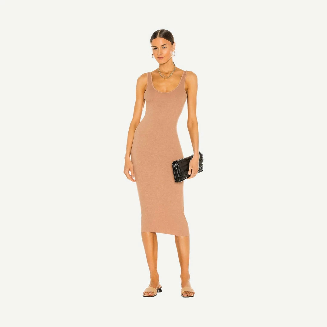 This essential midi dress from Enza Costa has a soft hand and scoop neckline, in this peach beige color it is sure to keep your silhouette polished.