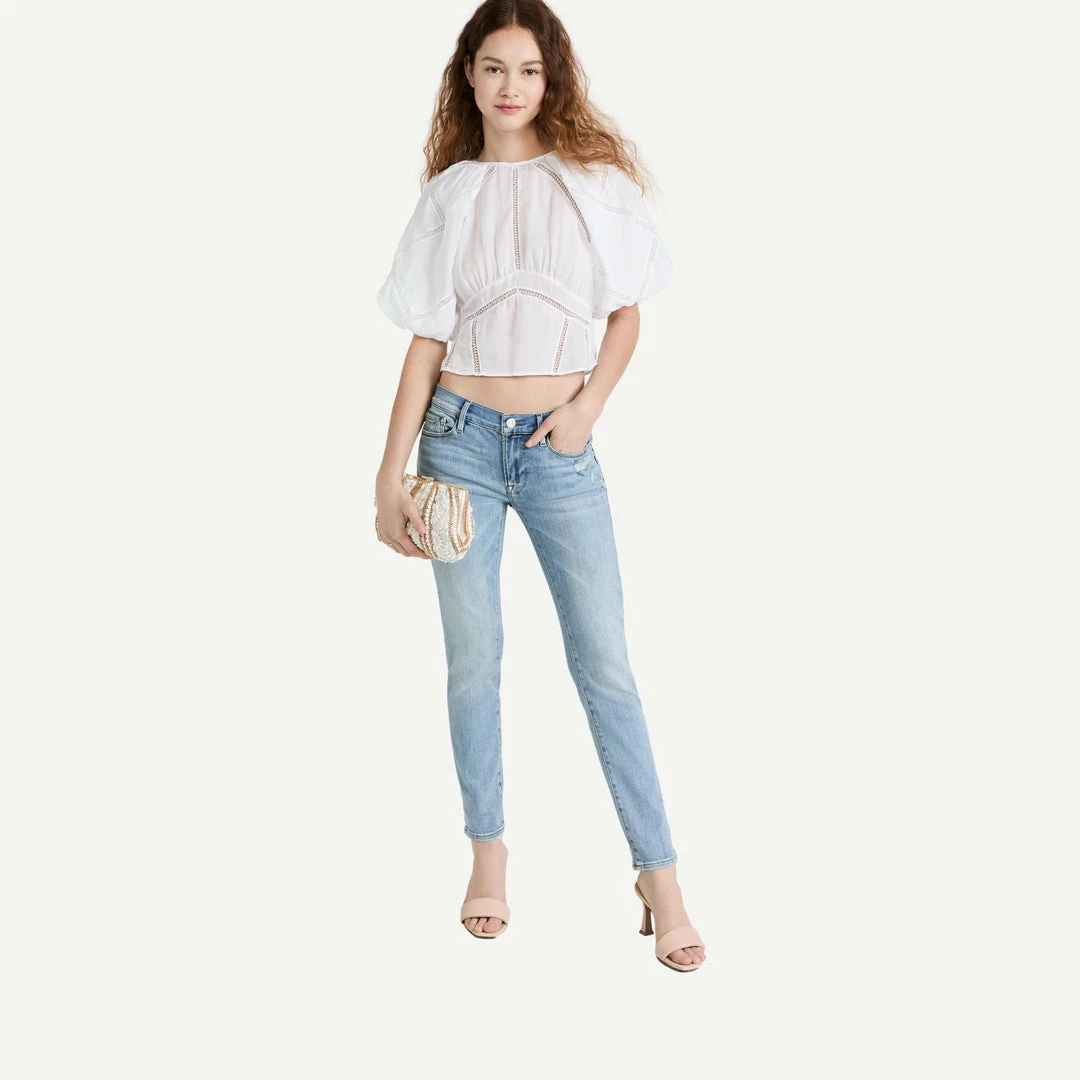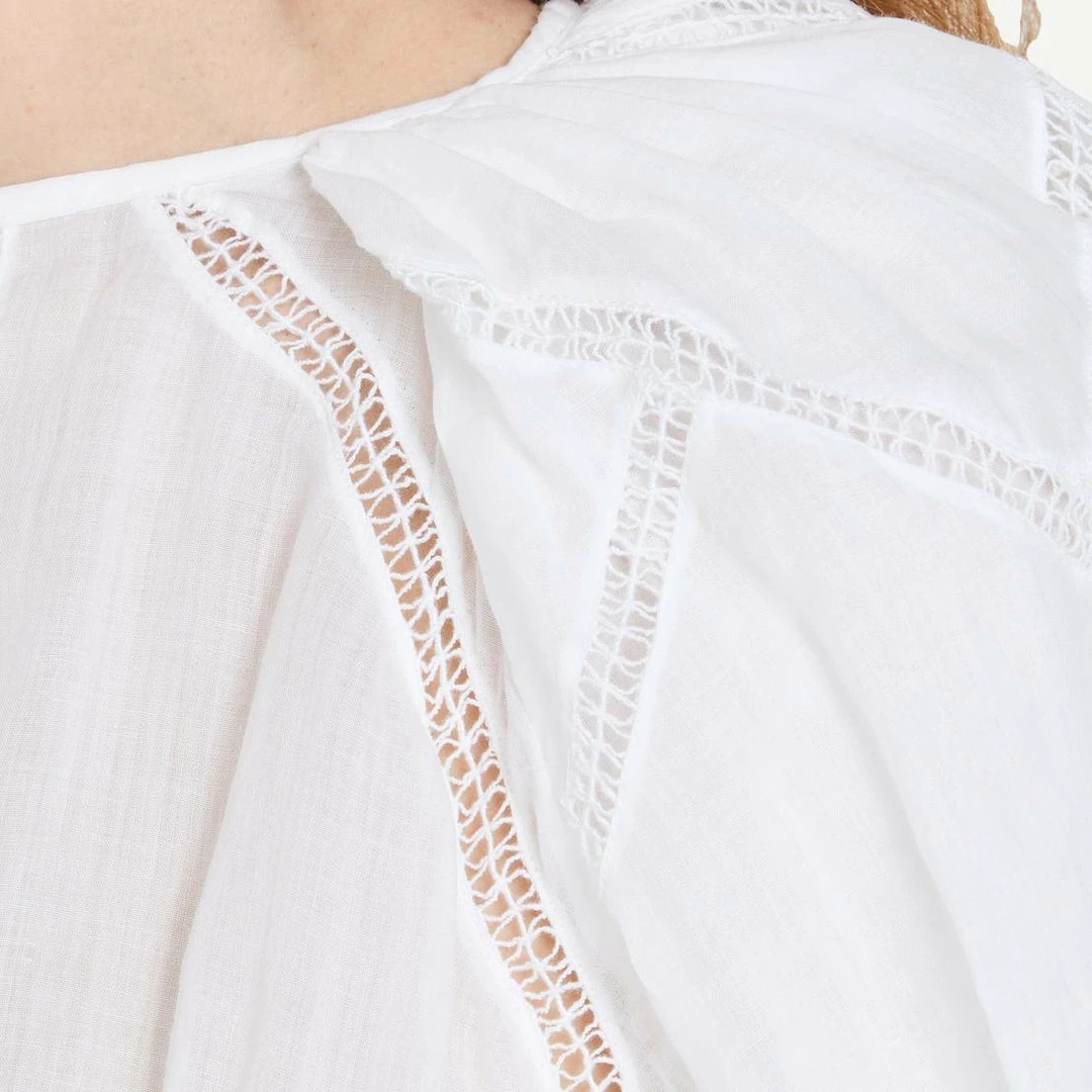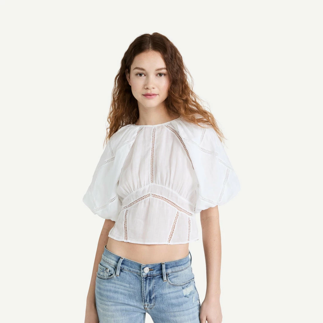 Stunning blouse with large blouson sleeves, inset lace details, and a semi sheer fabrication.