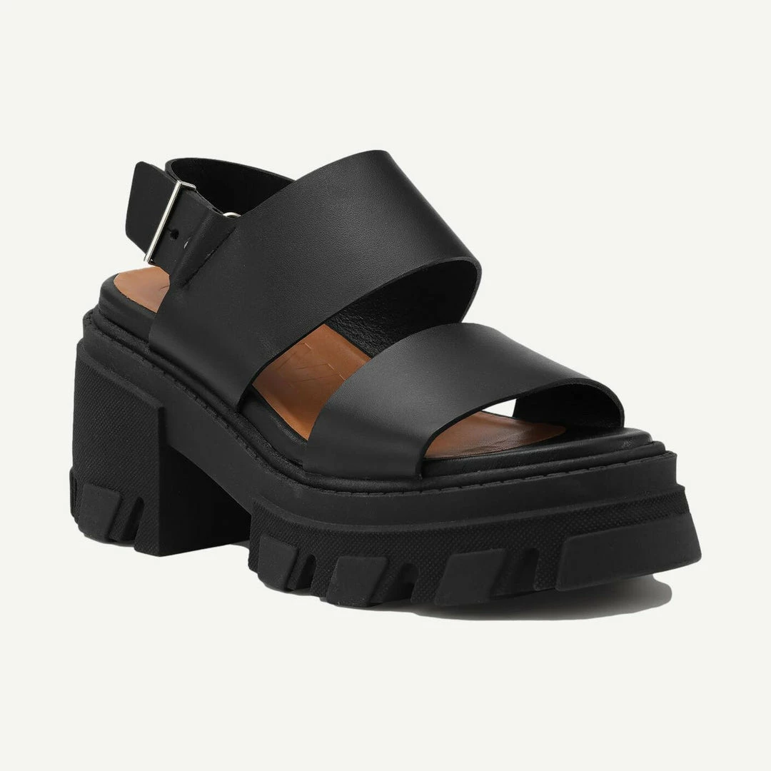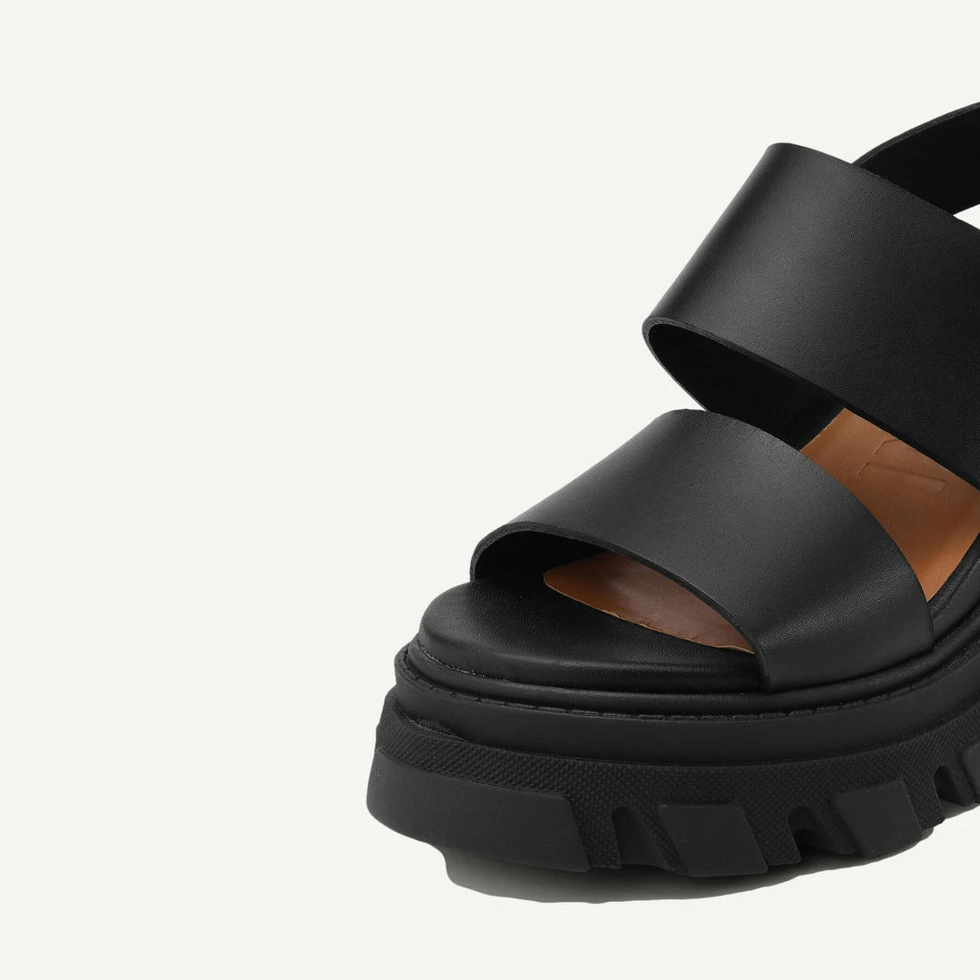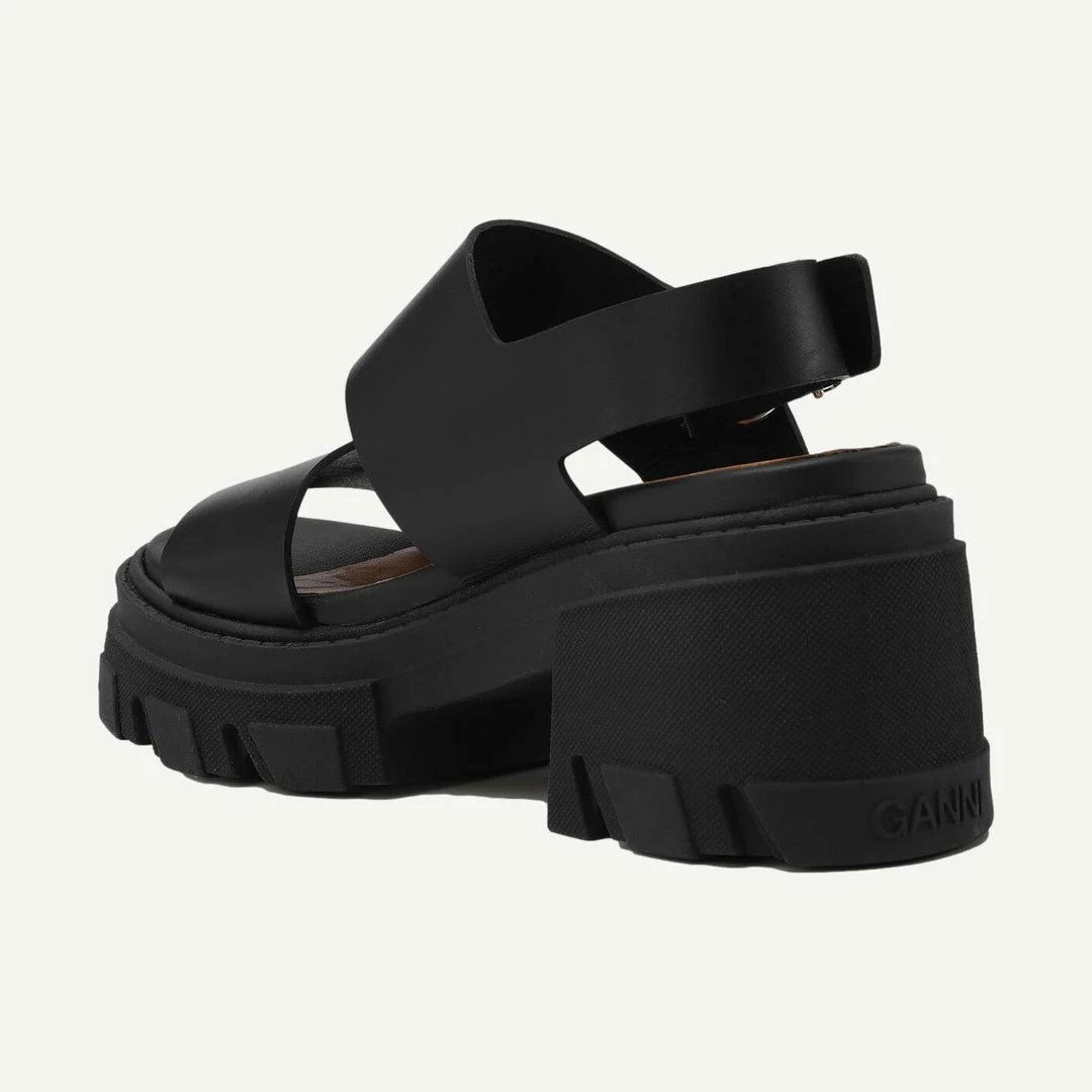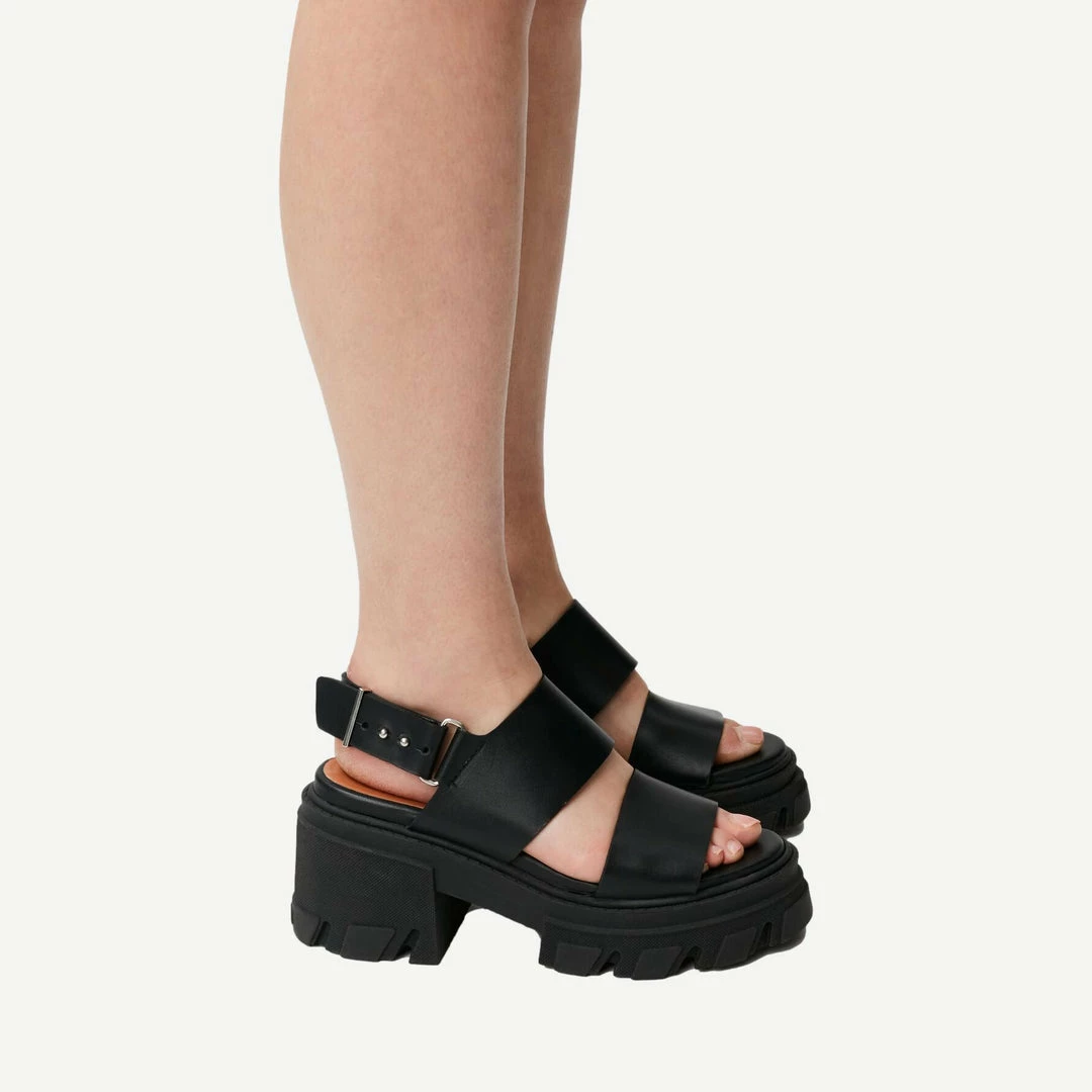 These are fun chunky sandals in leather, featuring wide straps, buckles, and cleated soles.