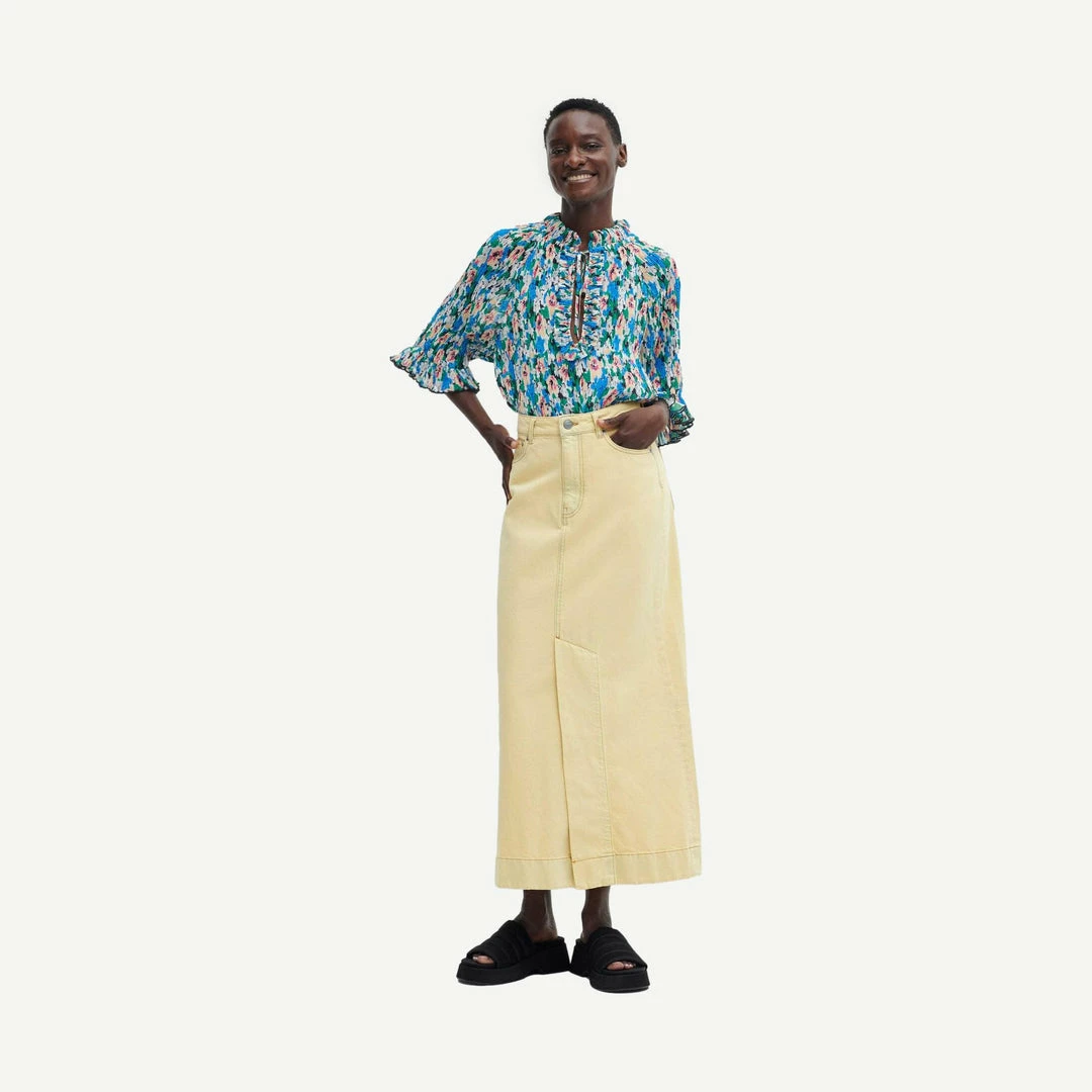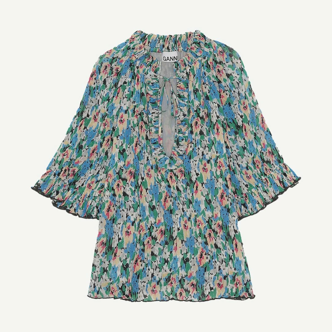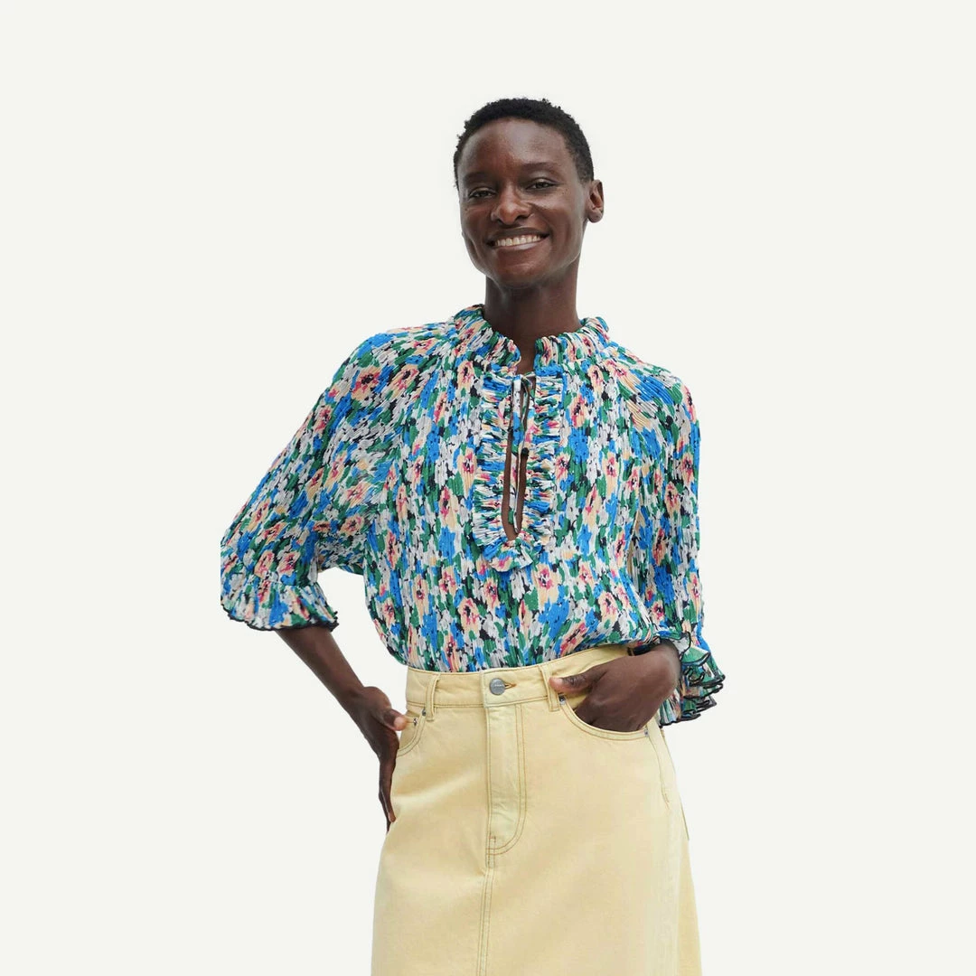 This is a timeless blouse in crepe viscose our new season print, featuring a drawstring v-neckline and raglan elbow-length sleeves with flounced hems. Cut straight from the shoulders for a relaxed fit. Style tucked into a denim maxi skirt.