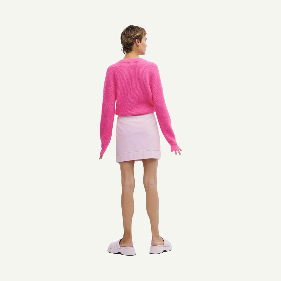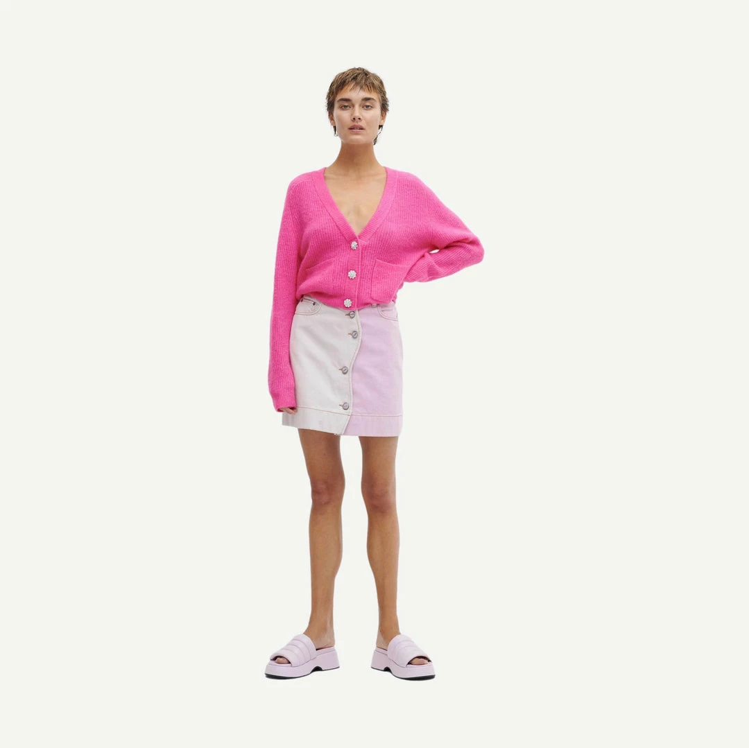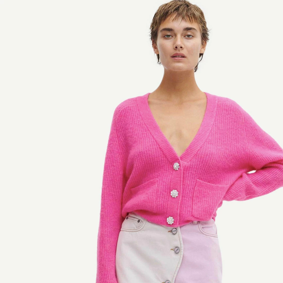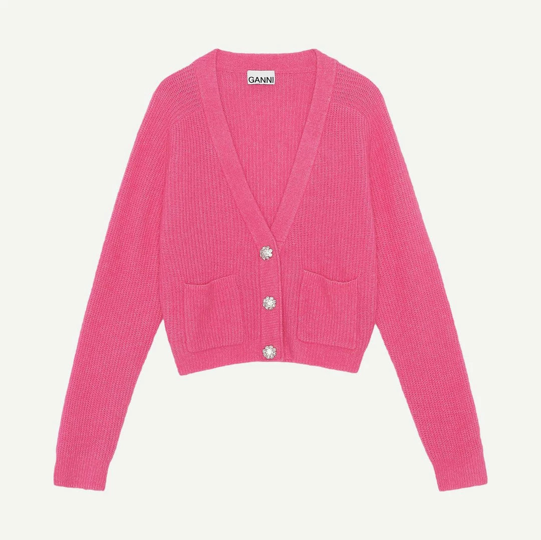 A signature GANNI silhouette, this is a relaxed button-up cardigan in fluffy wool-blend, finished with front slip pockets, crystal embellishment buttons. Cut for a relaxed fit, with a slightly tapered cropped hemline for a subtle bubble silhouette.