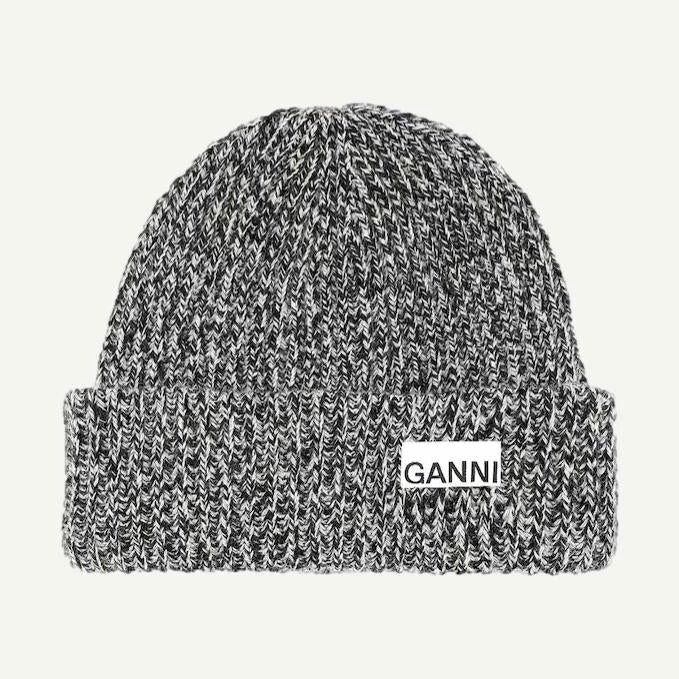 Classic knit beanie hat in ribbed recycled wool blend, finished with exposed GANNI logo tag. Perfect for everyday in cold weather.