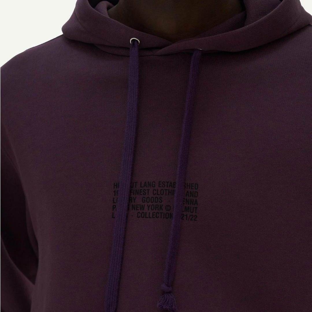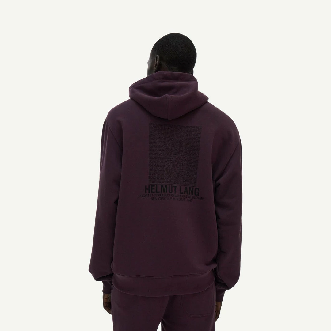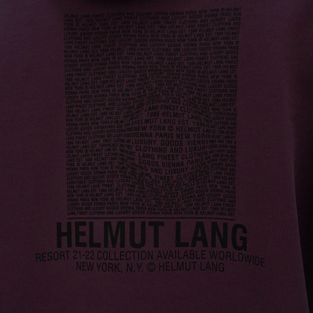 The Helmut Lang Distort Hoodie is a terry cotton sweatshirt with a drawstring hood, kangaroo front pocket, and graphic text details.