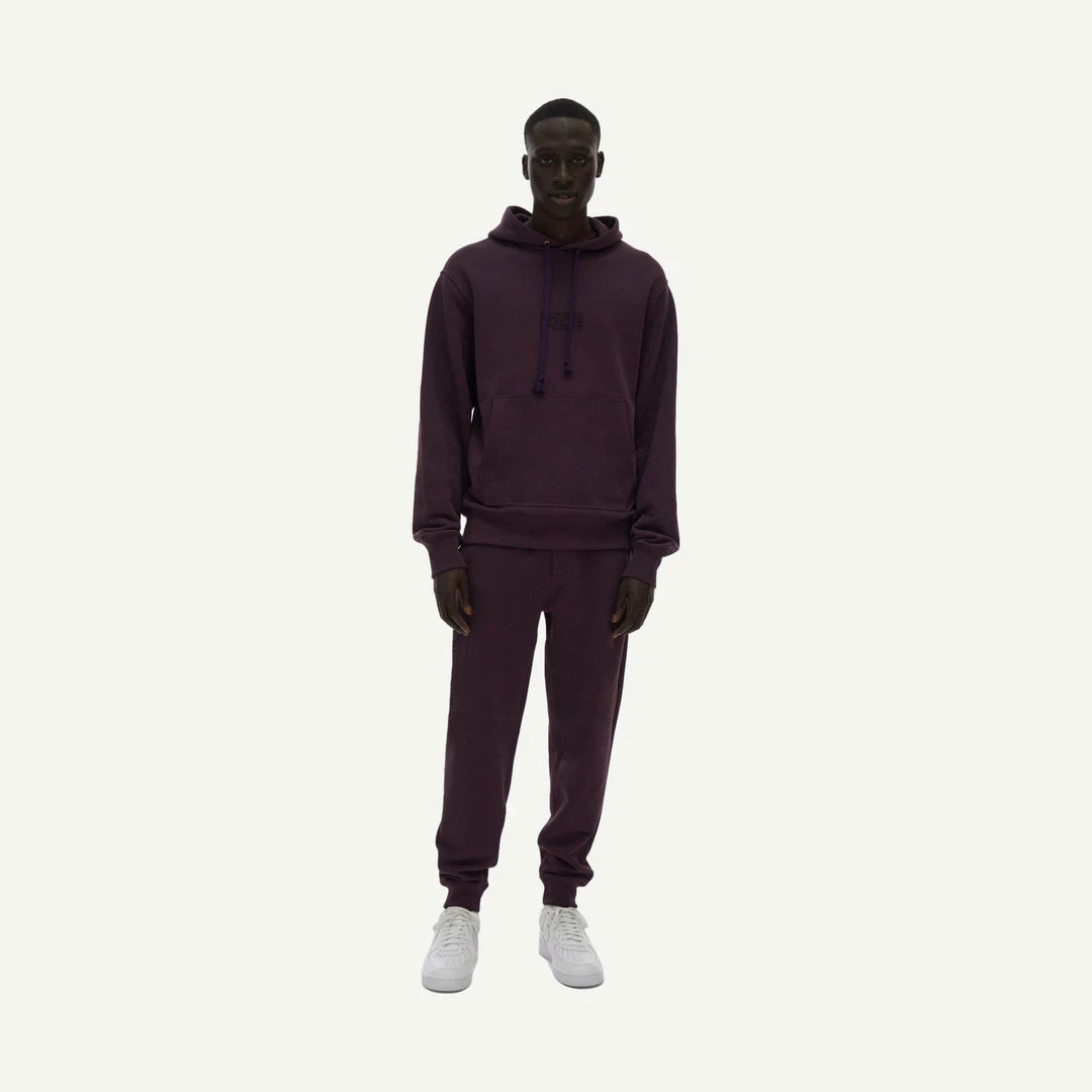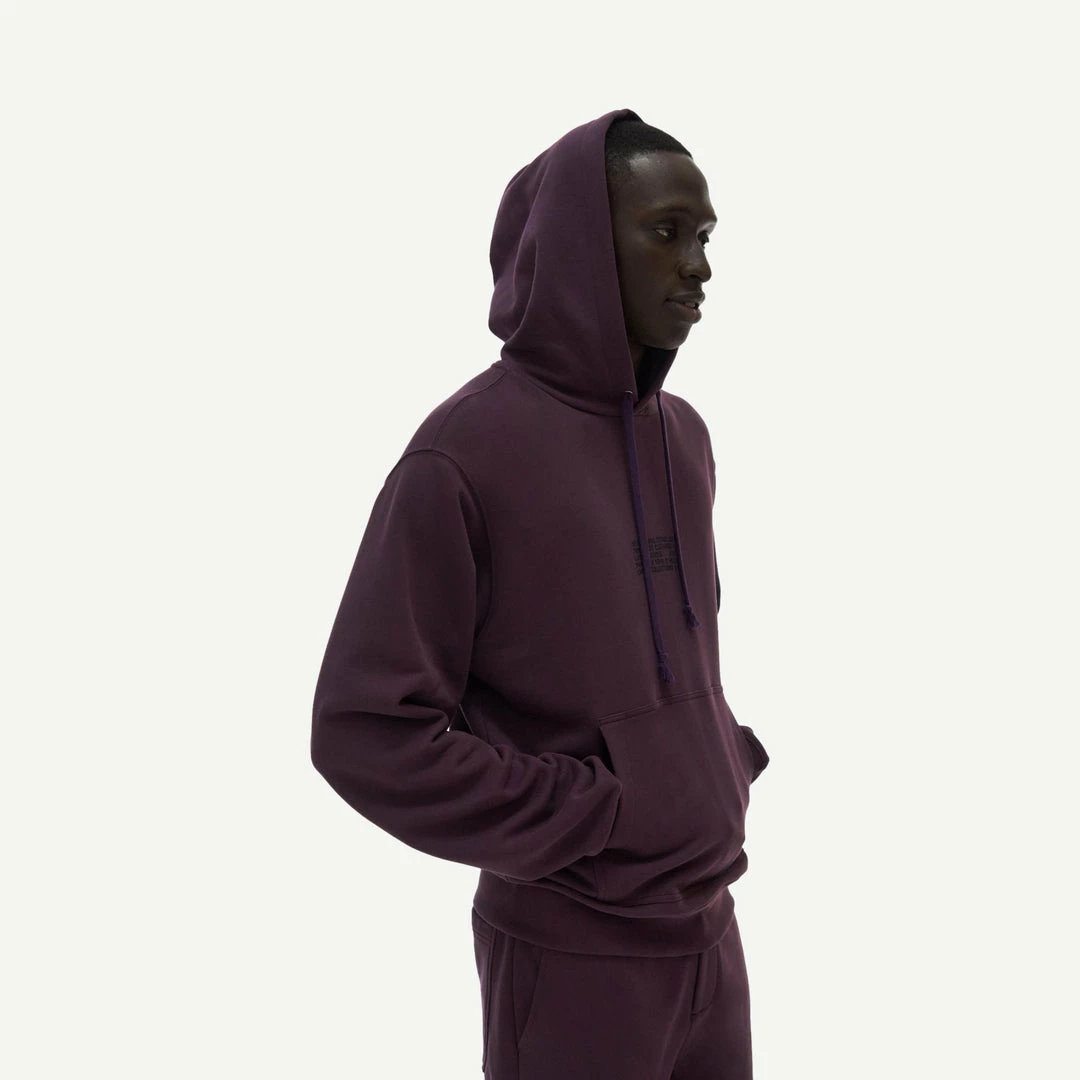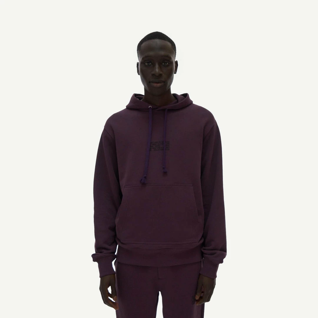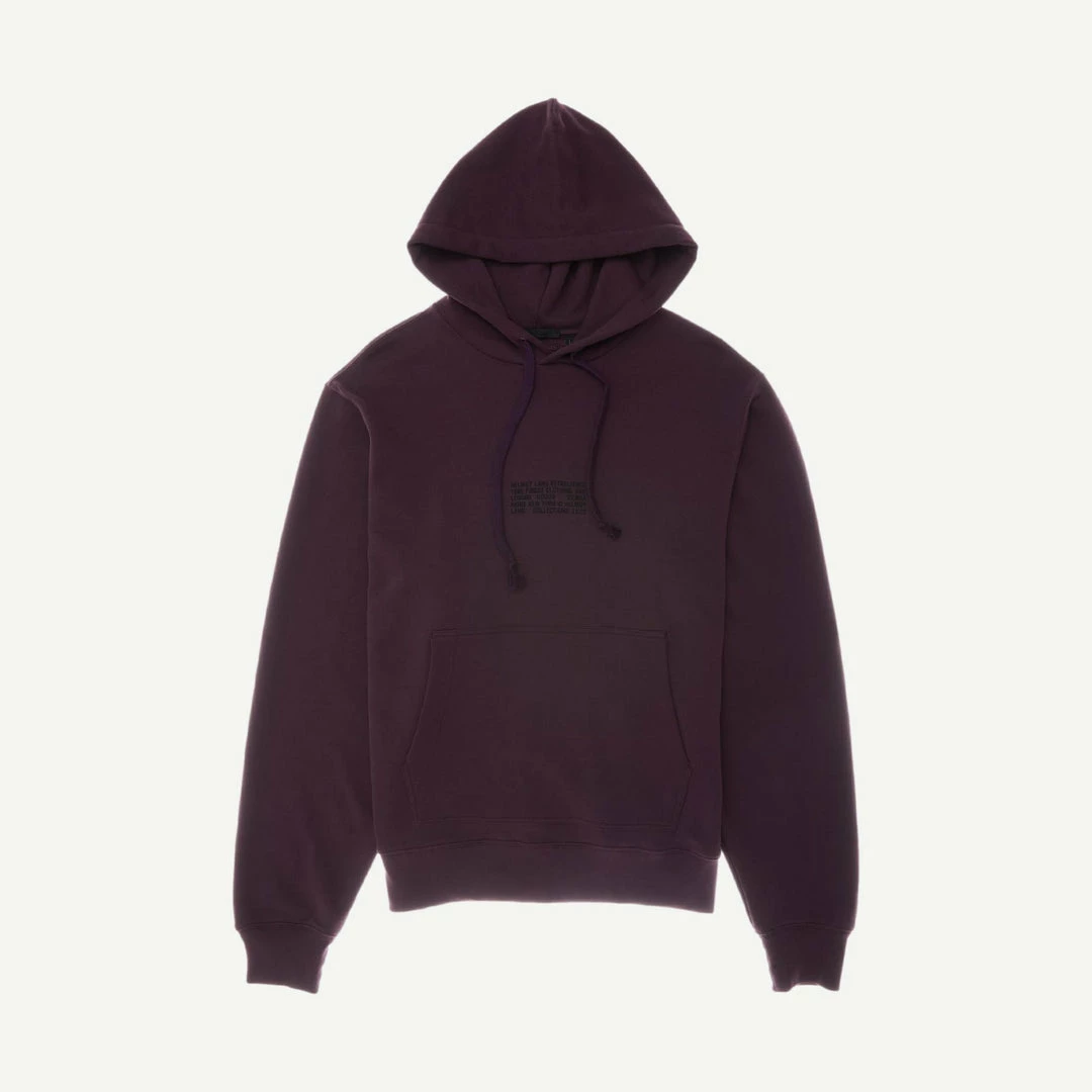 The Helmut Lang Distort Hoodie is a terry cotton sweatshirt with a drawstring hood, kangaroo front pocket, and graphic text details.