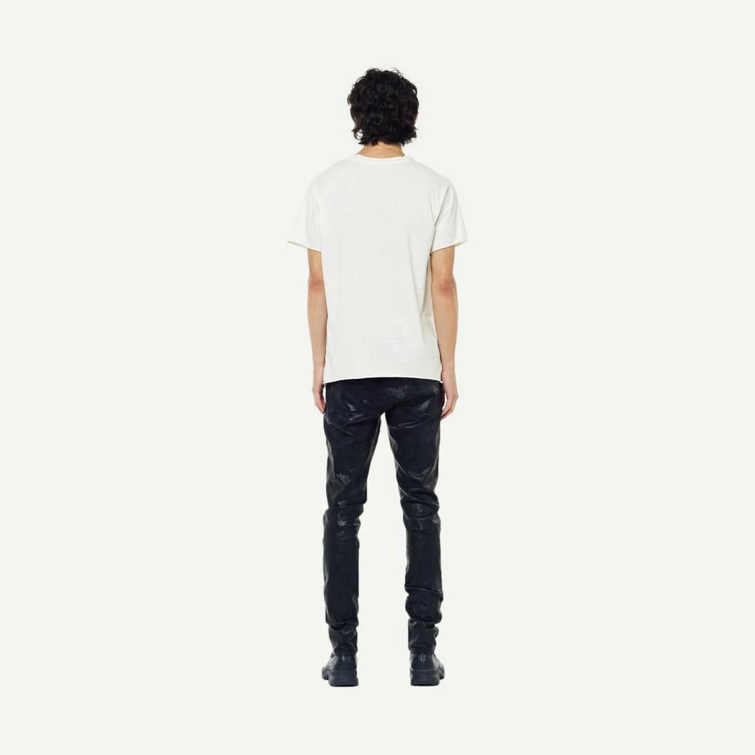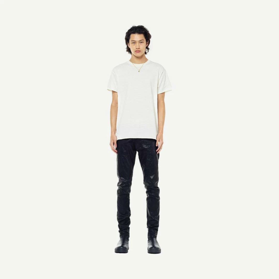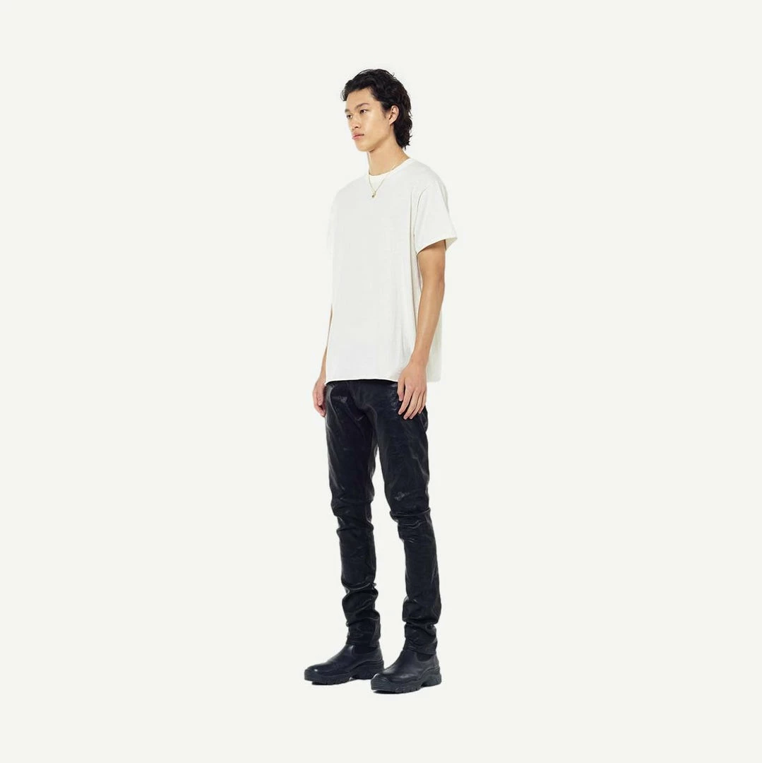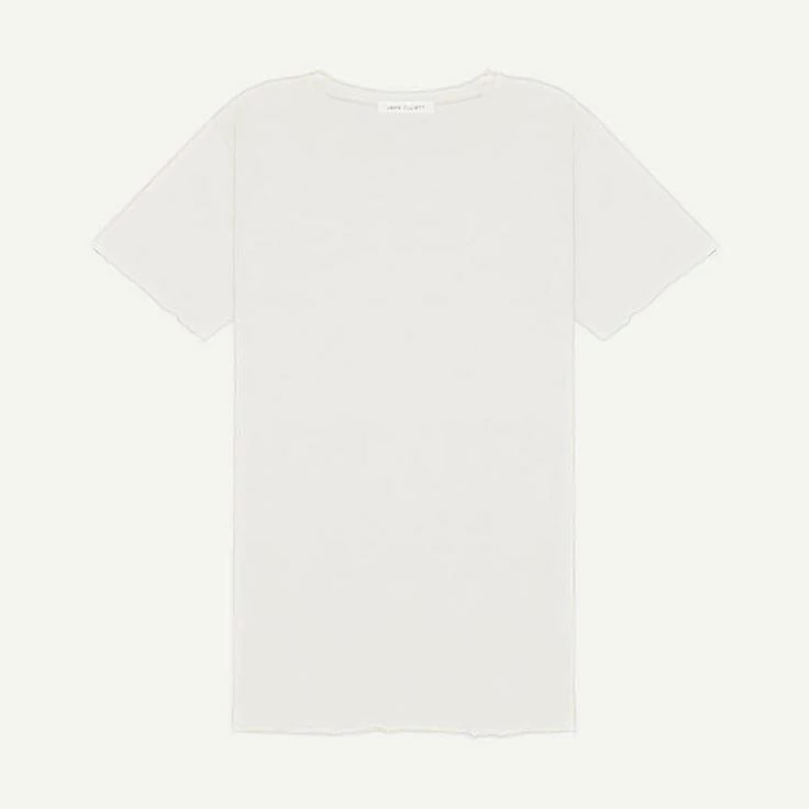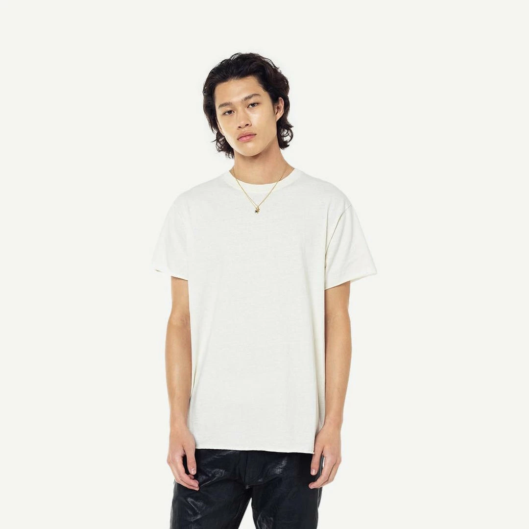 Relaxed fit tee with unfinished edges and a hem that is cut slightly longer in front than back. This tee is designed with midweight recycled cotton for slightly textured fabric. Made in Los Angeles.