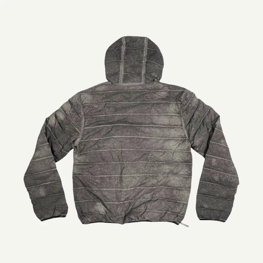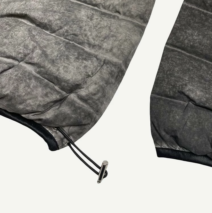 Light stretch nylon utilizes a special woven technique, so the down-filled compartments are automatically created. This avoids stitched seams where the feather is injected, and significantly increases the hold inside the chambers. The fabric is finished in Kojima, Japan with a Chusen machine, which allows complete control over the dye process. By applying a continuous spray to the garment, a custom color is created with artful use of negative space. Due to this treatment, each piece is completely unique, with slight variance in finish.