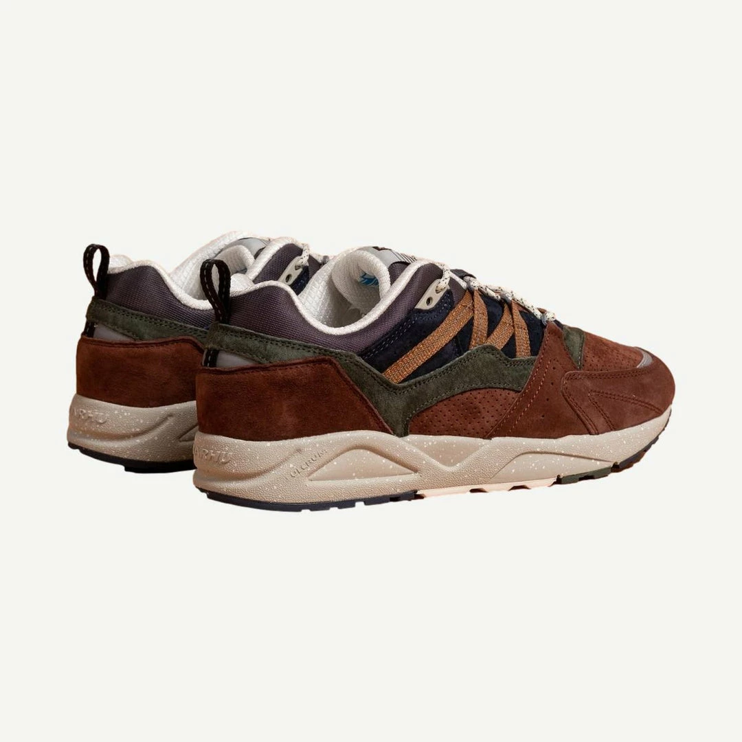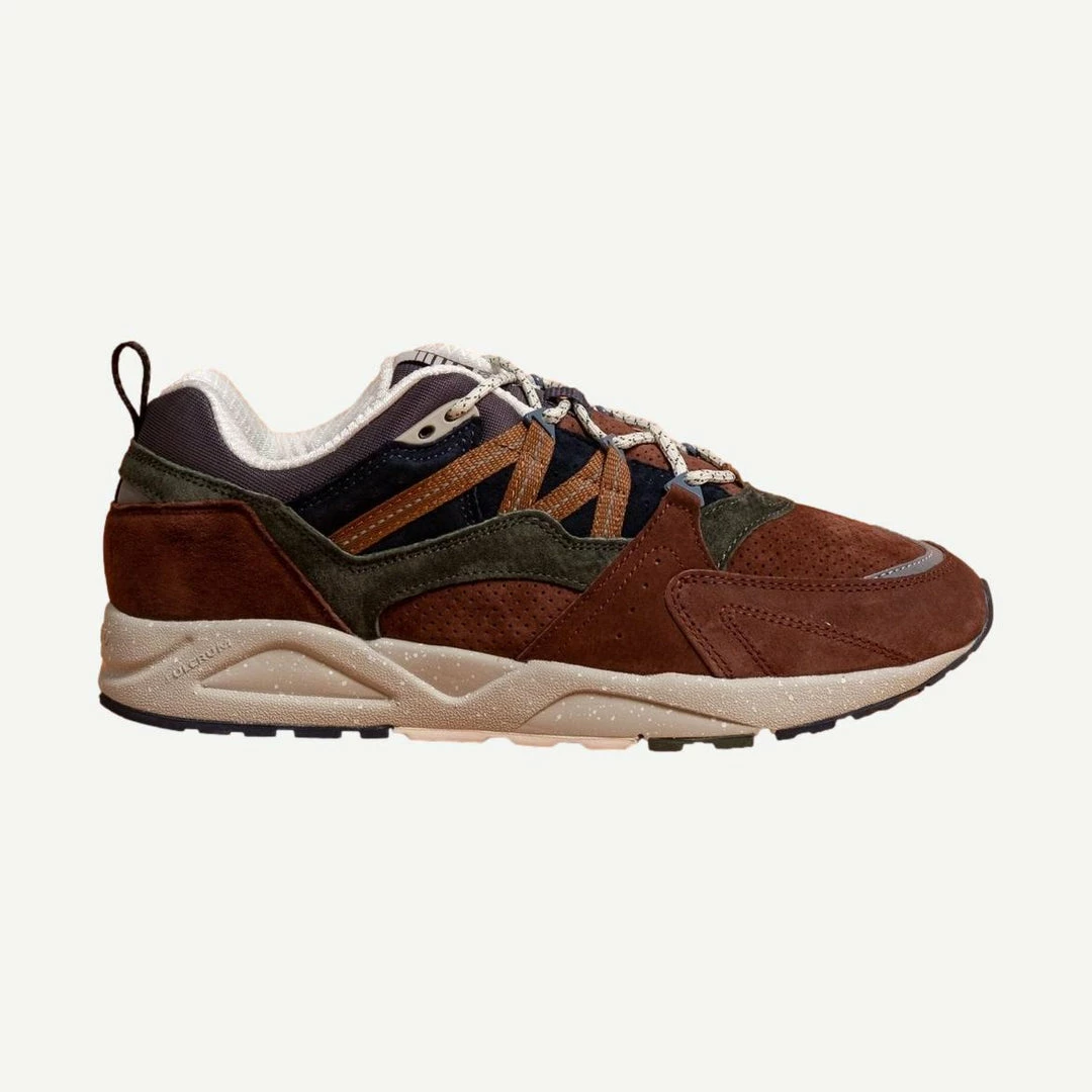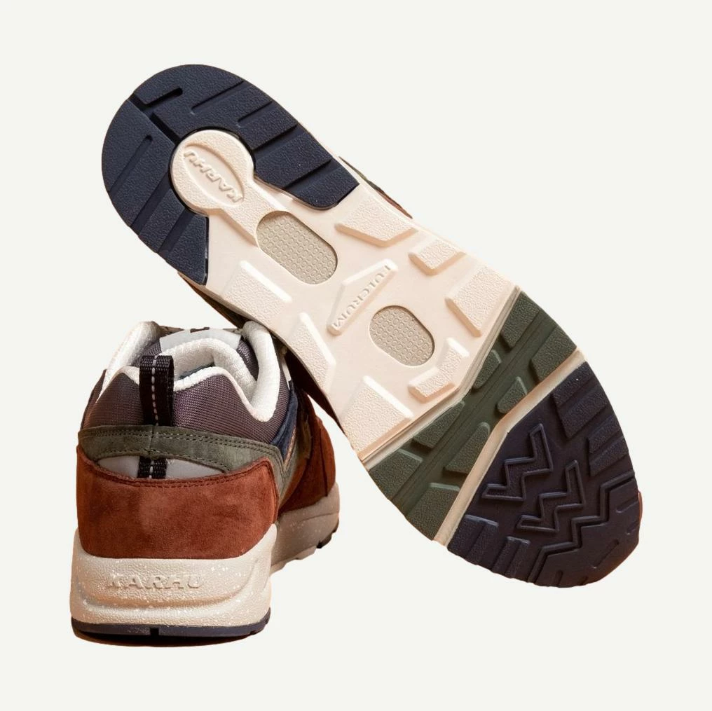 Karhu sneaker in redย suede, mesh upper, white green suede inserts,blue and orange contrasting details, reflective inserts and fulcrum technology midsole and rubber sole.