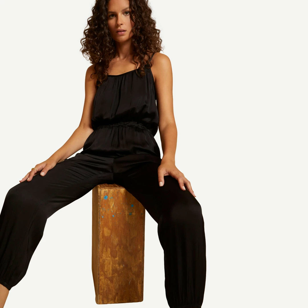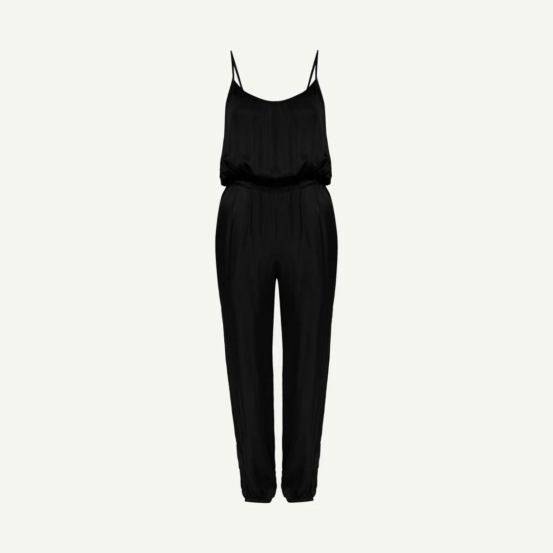 This jumpsuit is comfortable enough for lounging, but the Luxe Sateen and sexy keyhole closure in back make it chic enough to wear out. Ultimate versatility. Adjustable shoulder straps and an elastic waist, so you get the fit just right.