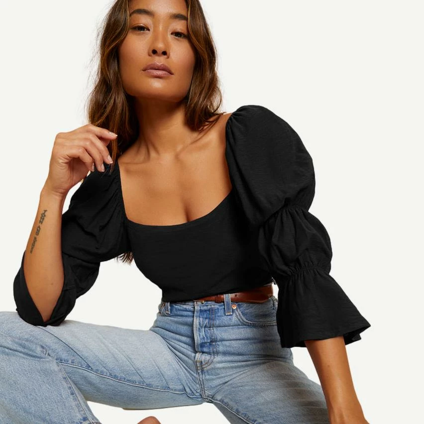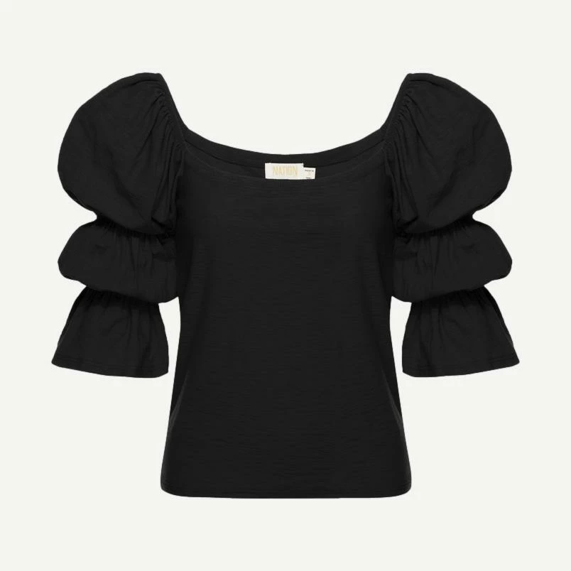 This has to be Nation’s most romantic tee yet. Let the renaissance inspired tiered sleeve with flounce cuff instantly elevate your look. Elastic at gathering.