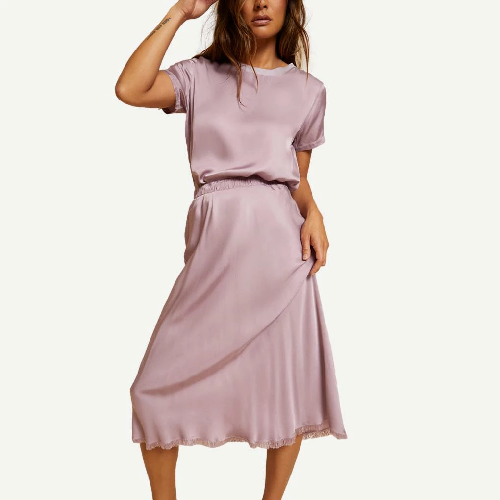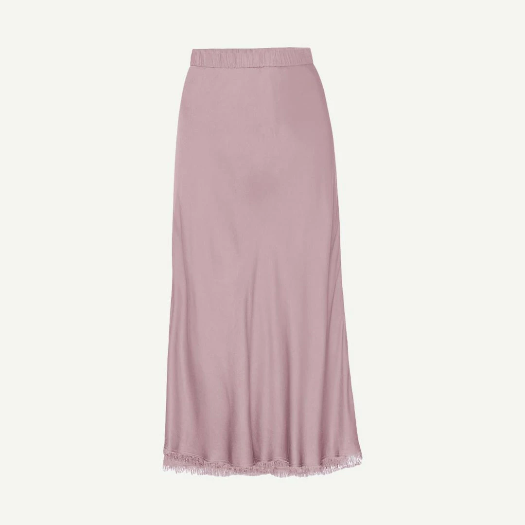 This raw hem, midi length skirt in luxe Sateen is cut on the bias which means a perfect slim fit that hugs all the right places. Elastic waist.
