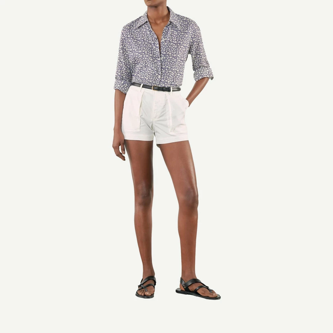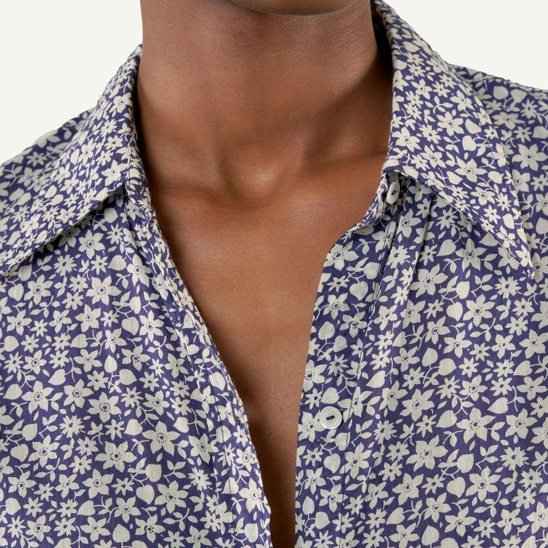 A foundational piece that transcends seasonality, The Kate Shirt is forever chic. It is a slim-fit cotton voile button-down printed with a blue and white microfloral that transitions easily from work to weekend. Darts on the back body emphasize the waist.