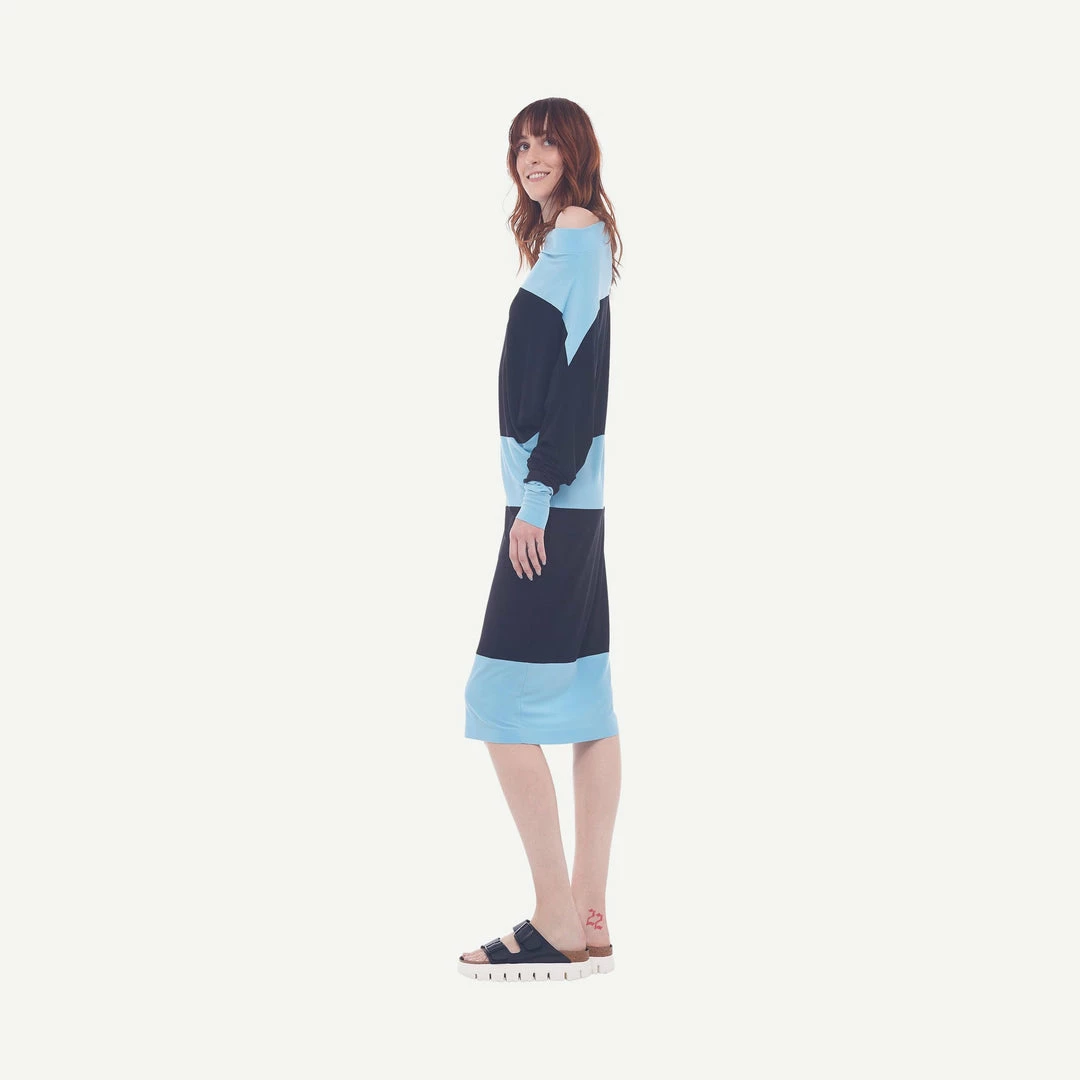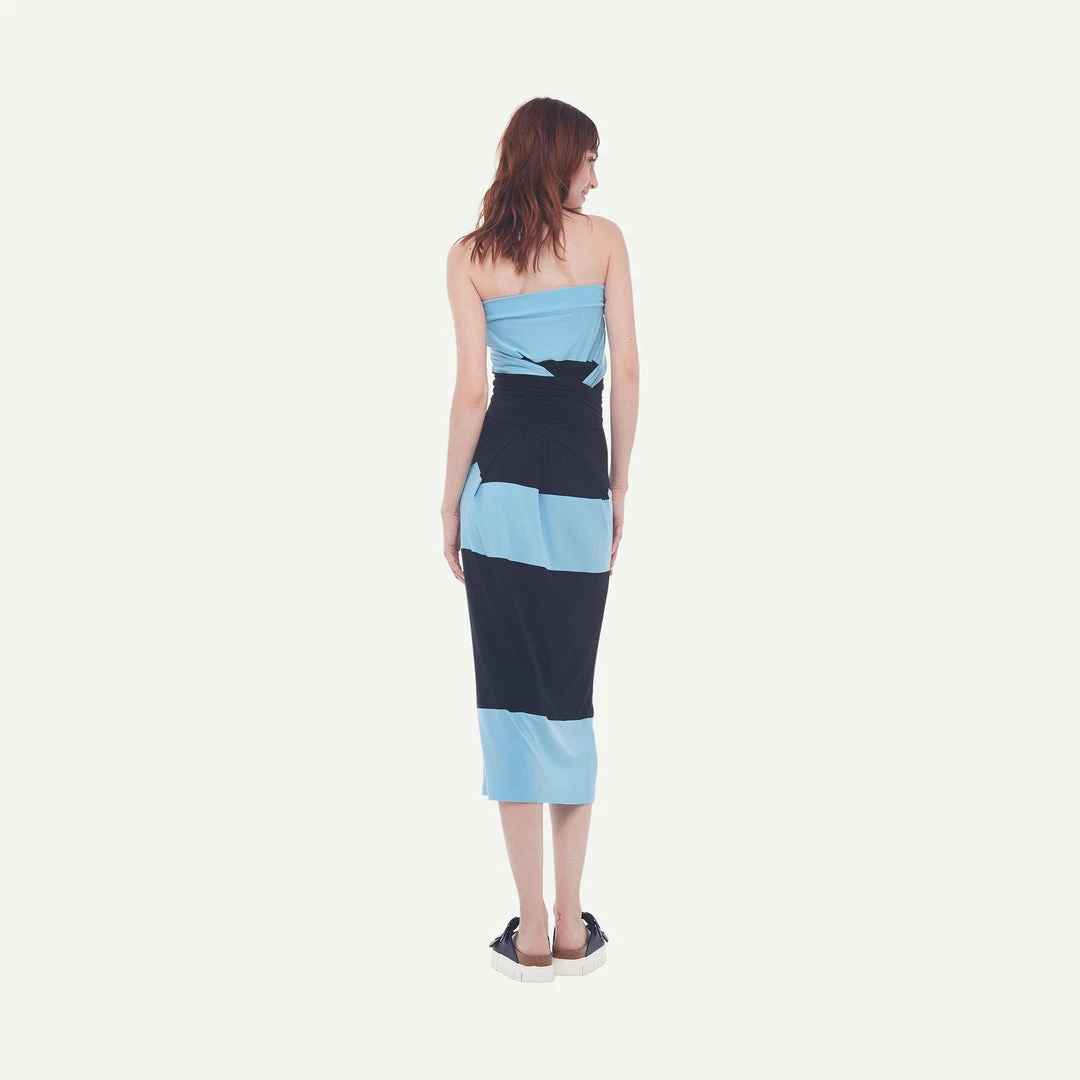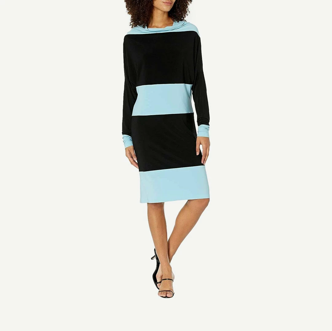 The all-in-one wrap silhouette of this black and blue dress is Normal Kamali’s signature that can be worn in multiple ways, emphasizing the designer’s focus on functionality. It’s crafted from striped stretch knit, with a wide boat neck and dolman sleeves to be styled as a classic sweater dress, one shoulder or strapless design.