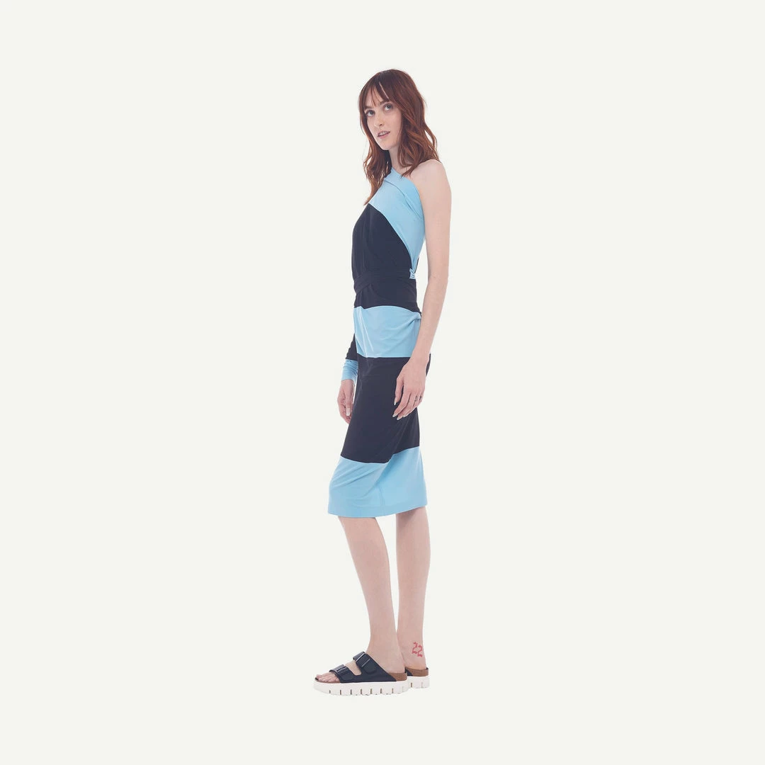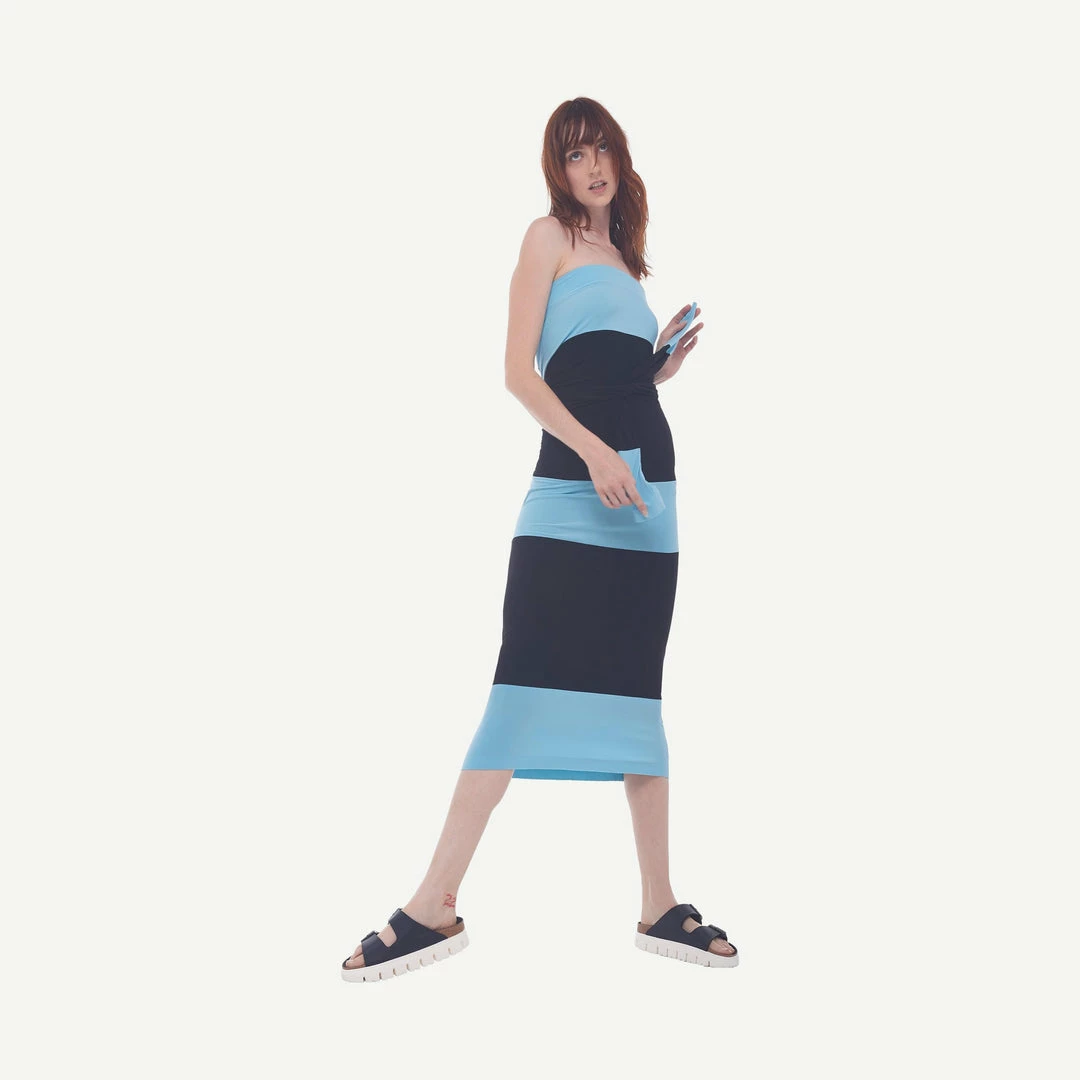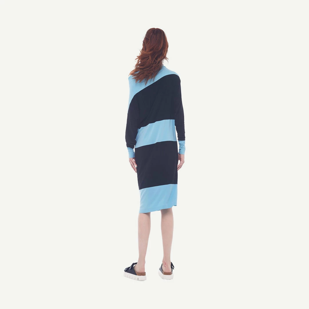 The all-in-one wrap silhouette of this black and blue dress is Normal Kamali’s signature that can be worn in multiple ways, emphasizing the designer’s focus on functionality. It’s crafted from striped stretch knit, with a wide boat neck and dolman sleeves to be styled as a classic sweater dress, one shoulder or strapless design.