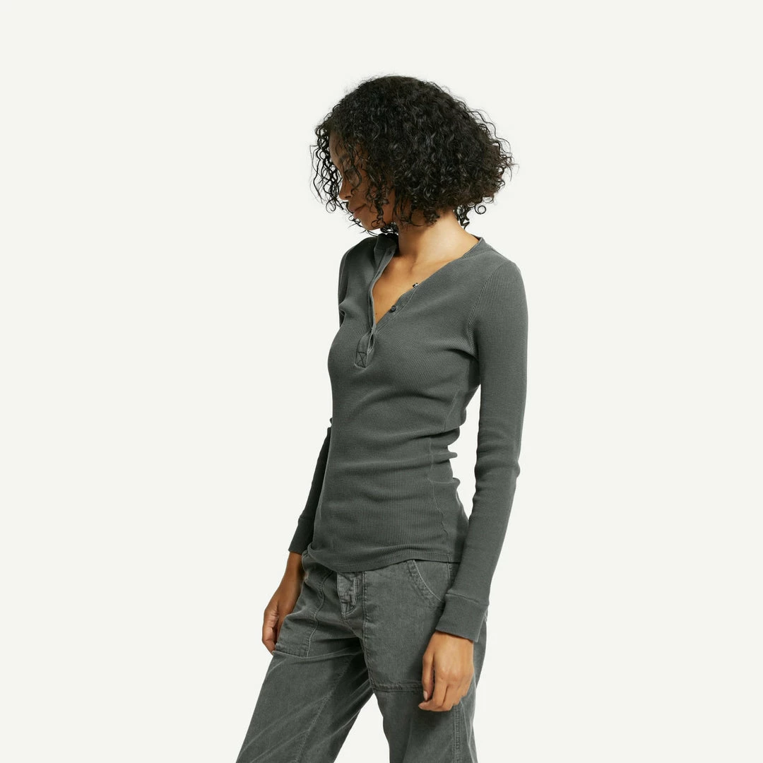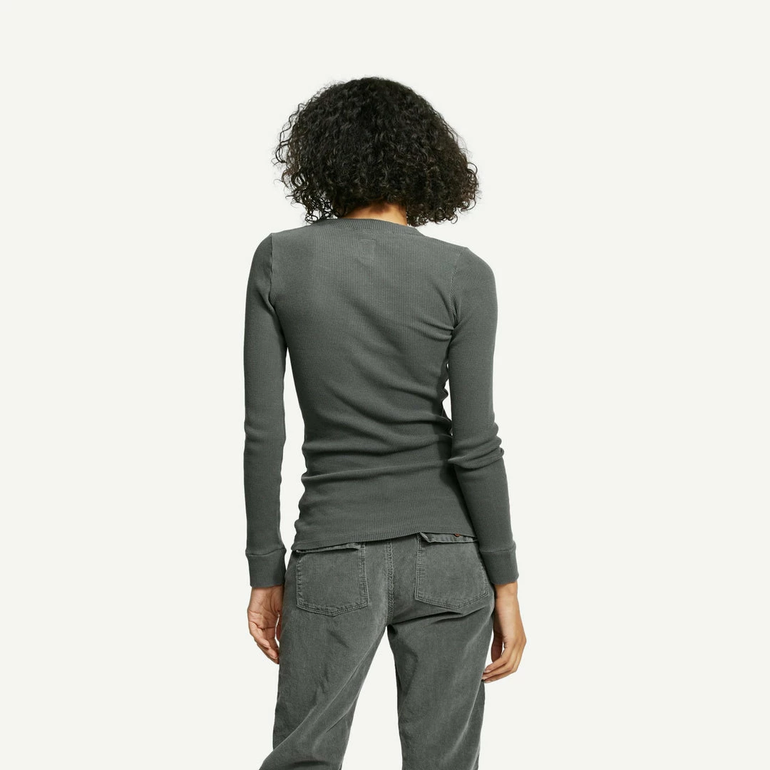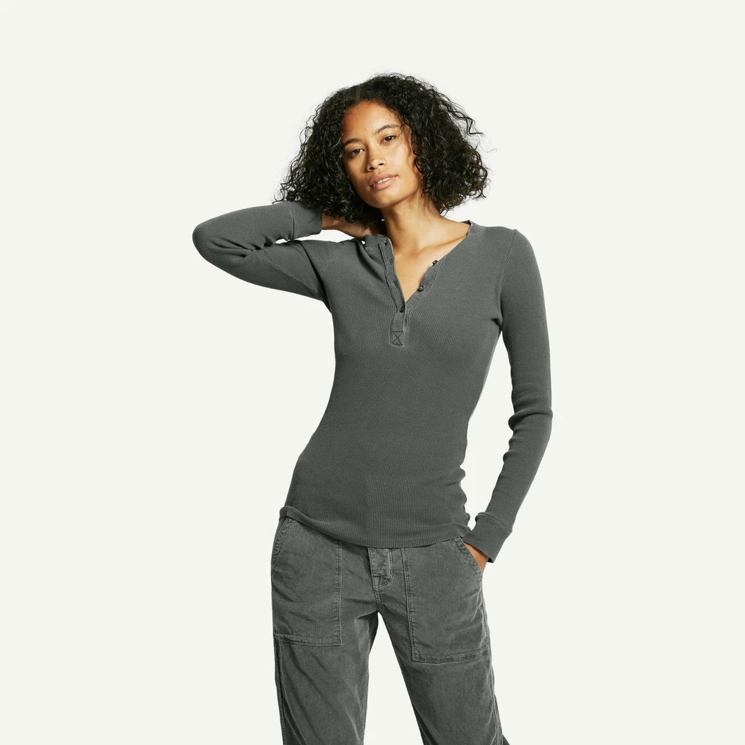 The Henri slim henley from NSF is a fitted ribbed top with a partial button placket. Elevate a pair of sweats or wear this long sleeve with your favorite denim for an everyday put-together look