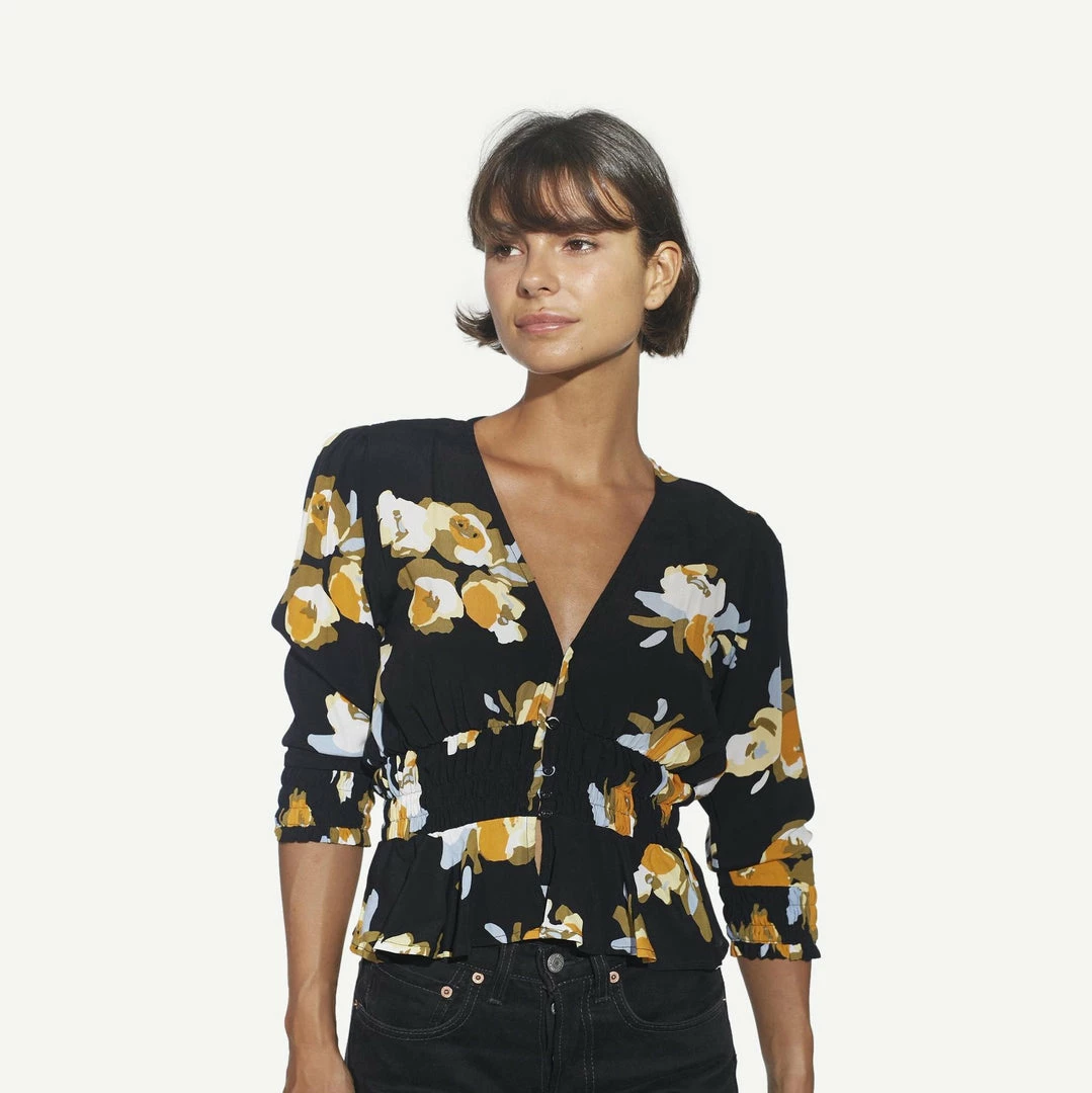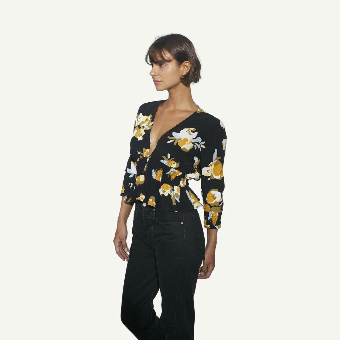 The Maren blouse from Rue Stiic is the ultimate wardrobe must have, featuring their exclusive Marigold Floral print, this stunning blouse will be your go to grab all year round! This stunning blouse features a V-neckline and button up front, 3/4 length sleeves, a tapered waistline and loose ruffle finish. The Maren blouse is the ultimate piece to take you from chic office look to afterwork drinks.