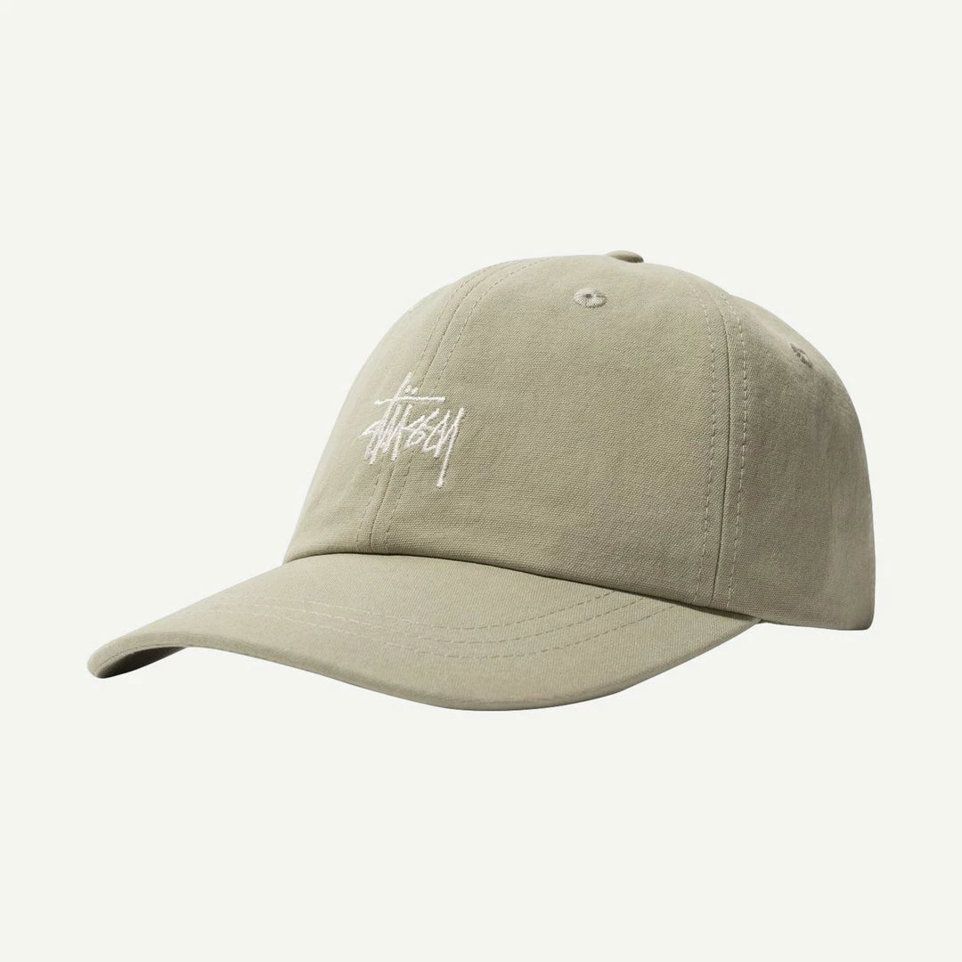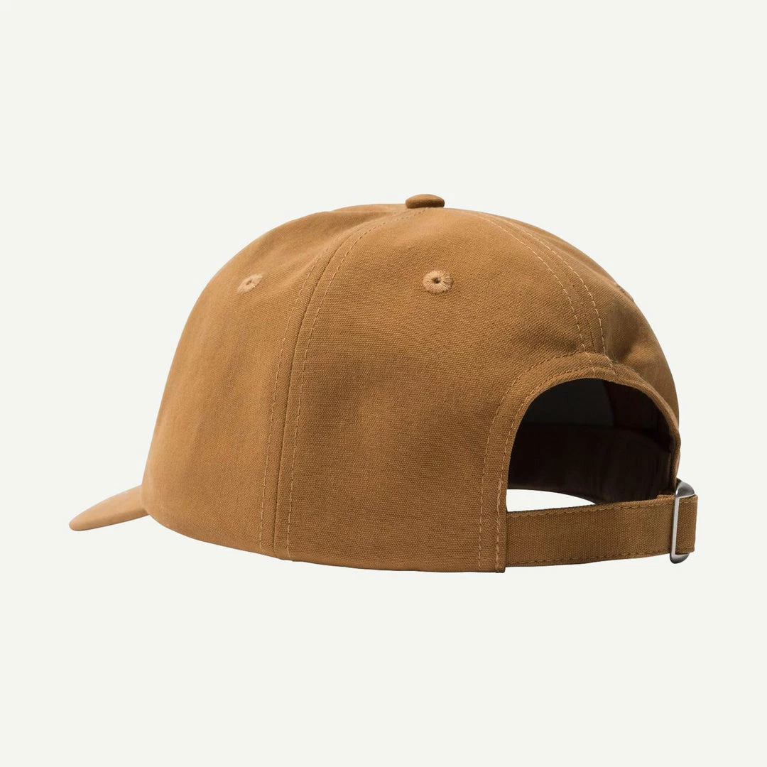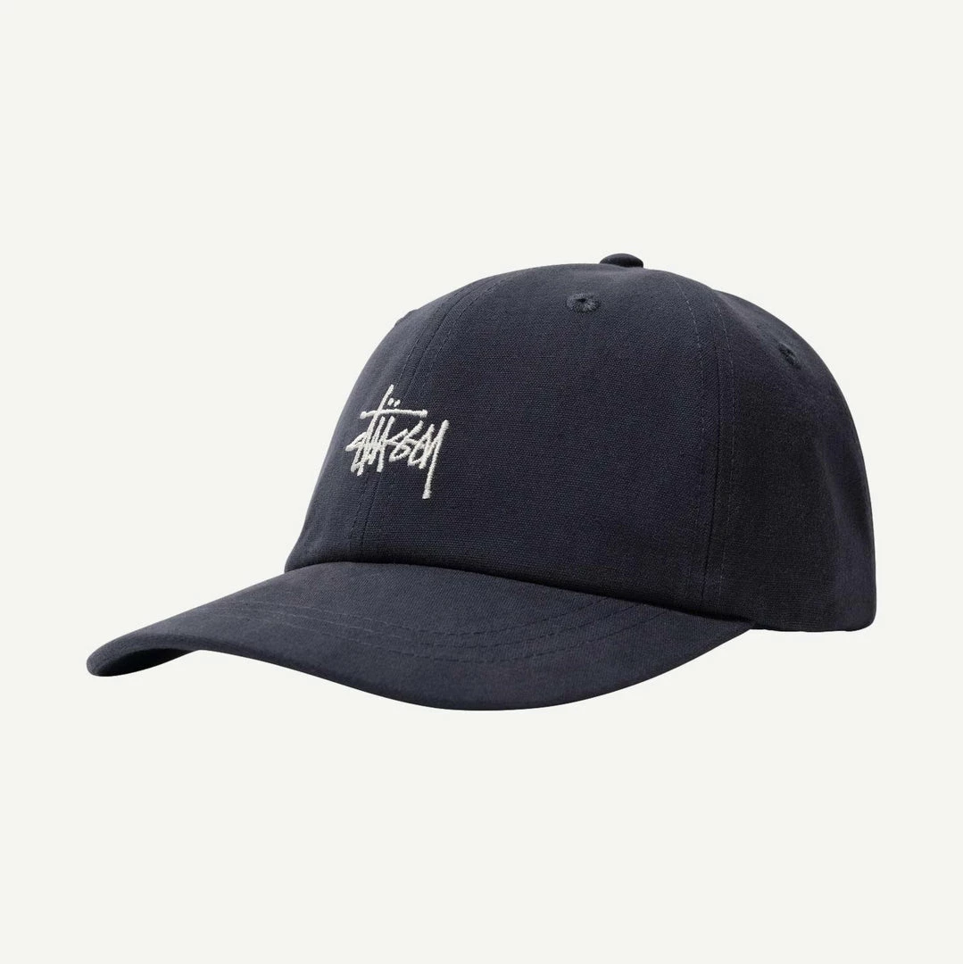 Canvas 6-panel cap with Stüssy logo embroidery. Unstructured low-profile crown, woven eyelets, and strapback closure with metal triglide.