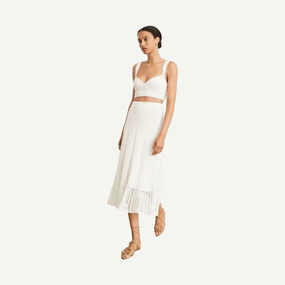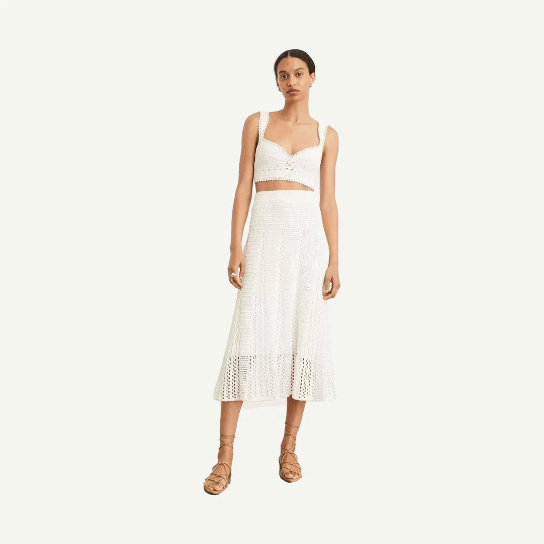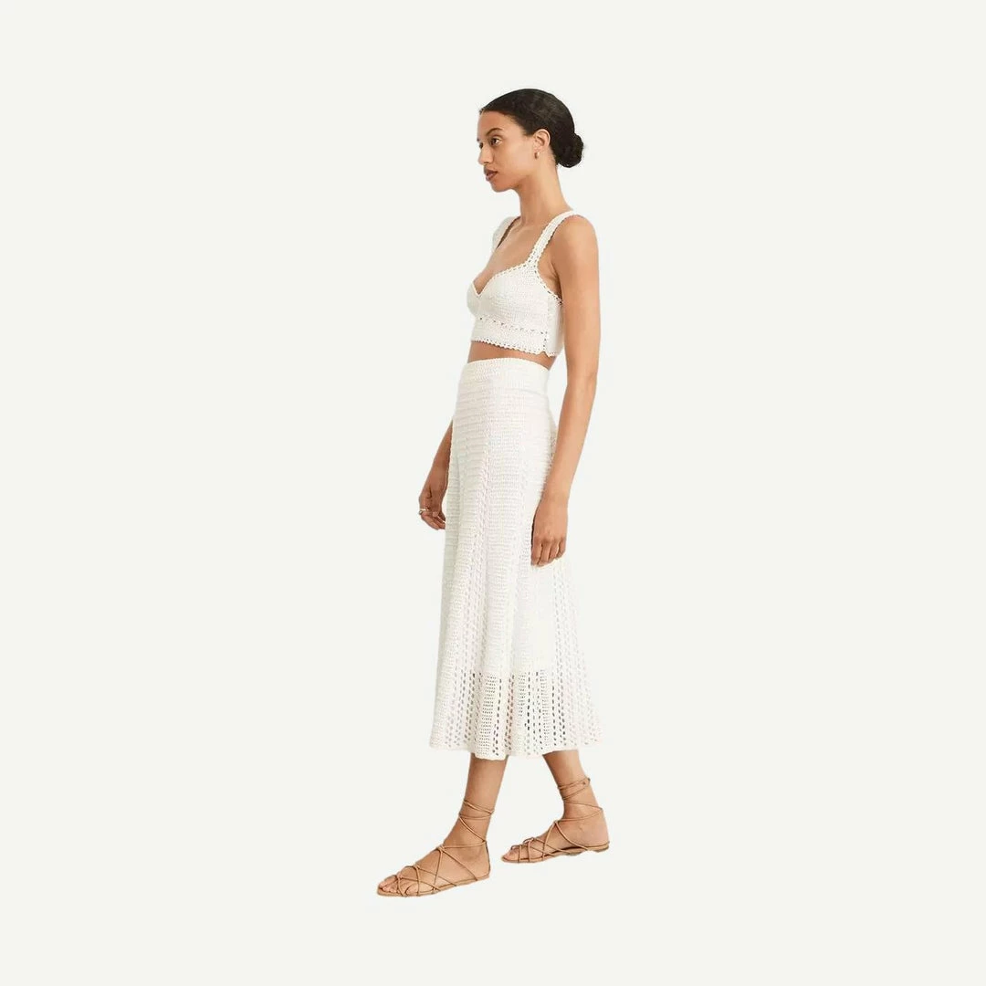 Woven from Italian organic cotton cord, our crochet-like skirt blooms with godets for sweeping movement. Its half-lined silhouette features a peek of skin at the knee.