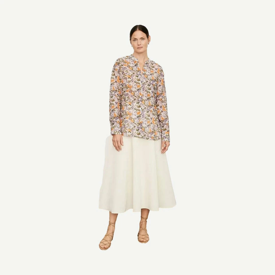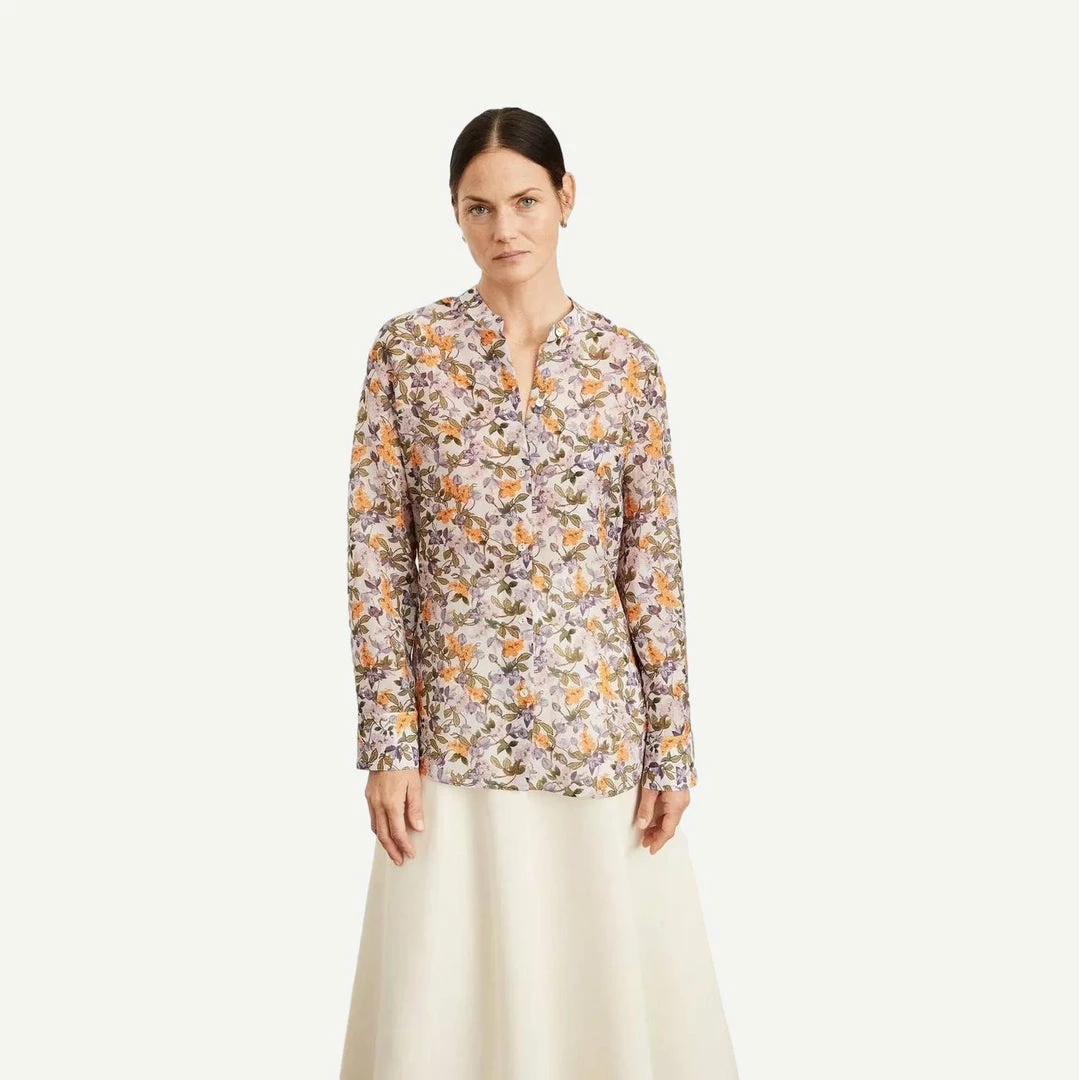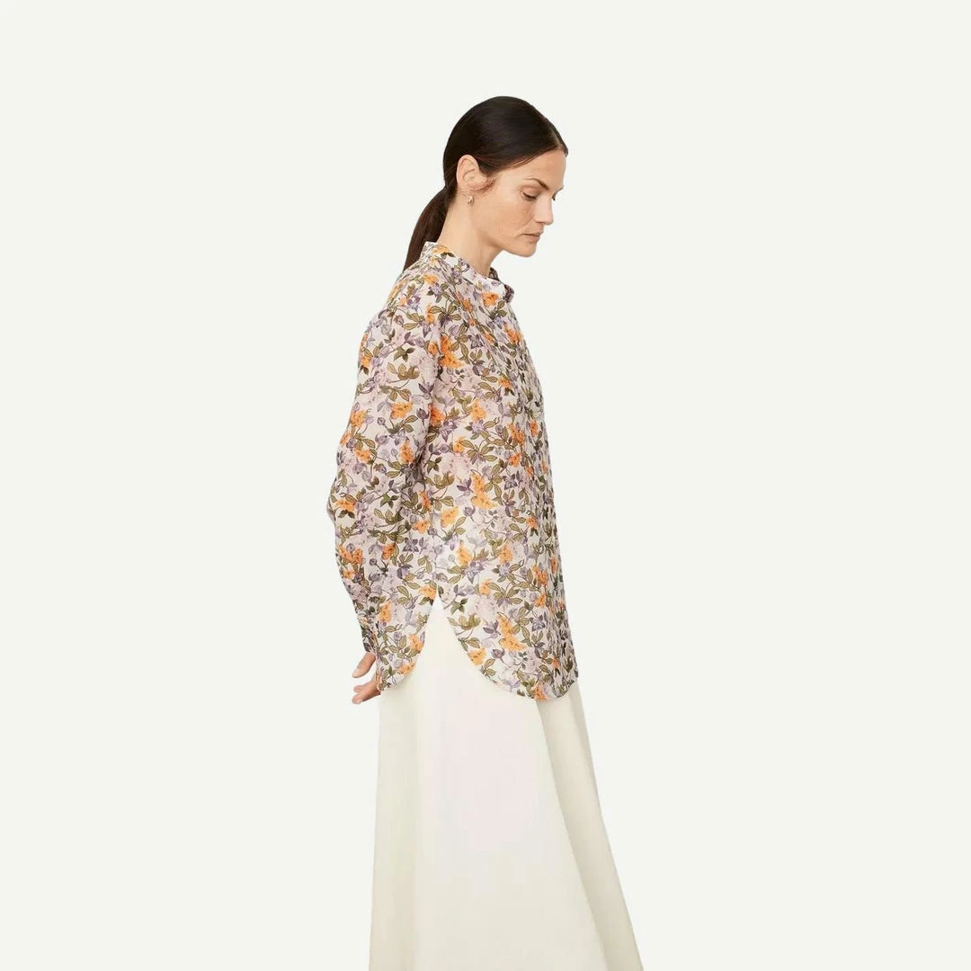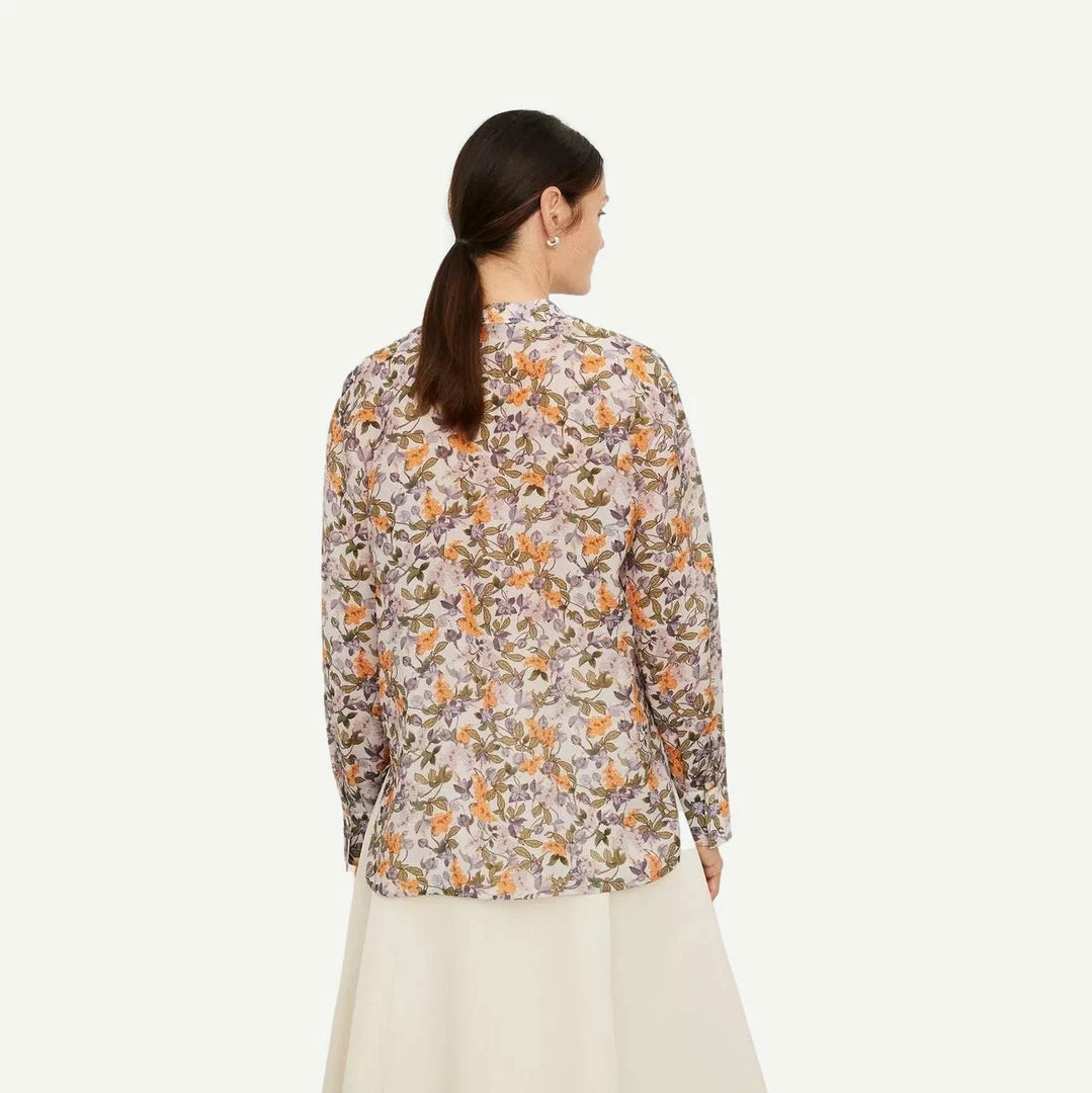 Delicate blooms pattern our beautifully draped oversized shirt, finished with a band collar and a chest pocket.