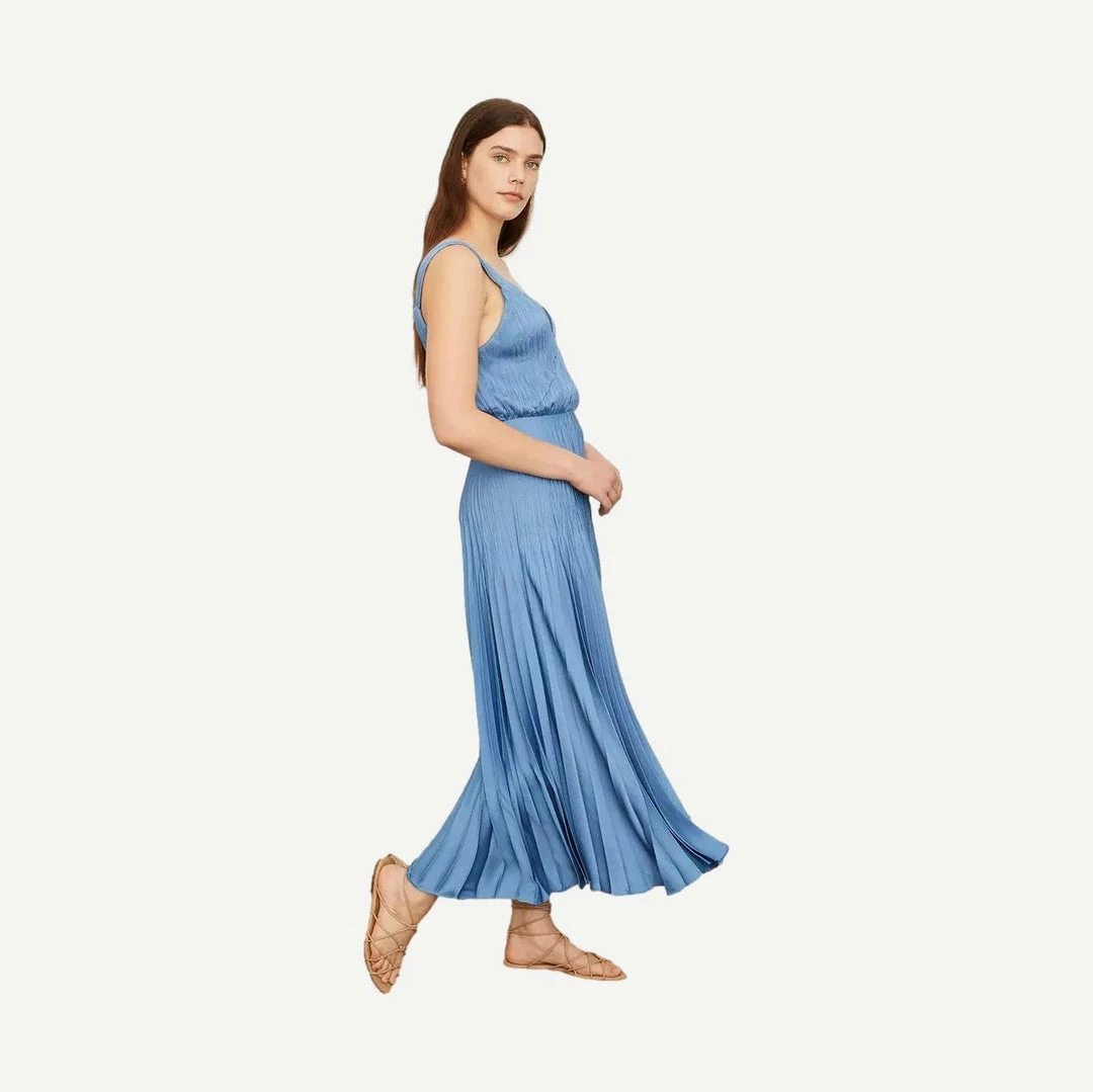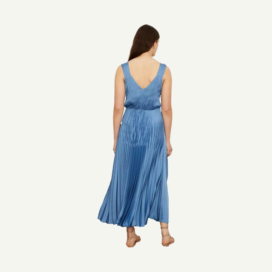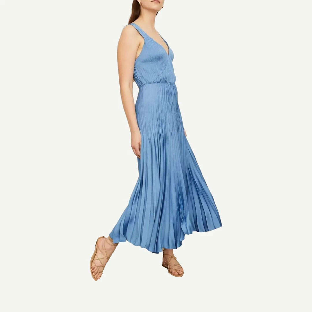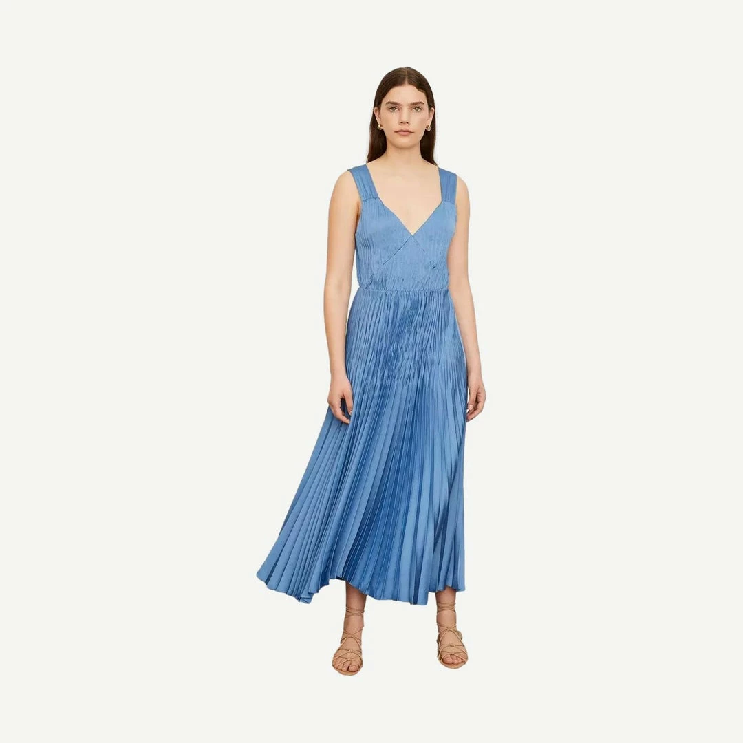 Rendered in incandescent satin, our pleated dress features a becoming, sweeping V-neckline and fitted bodice. The skirt blooms open for easy movement to capture the light.