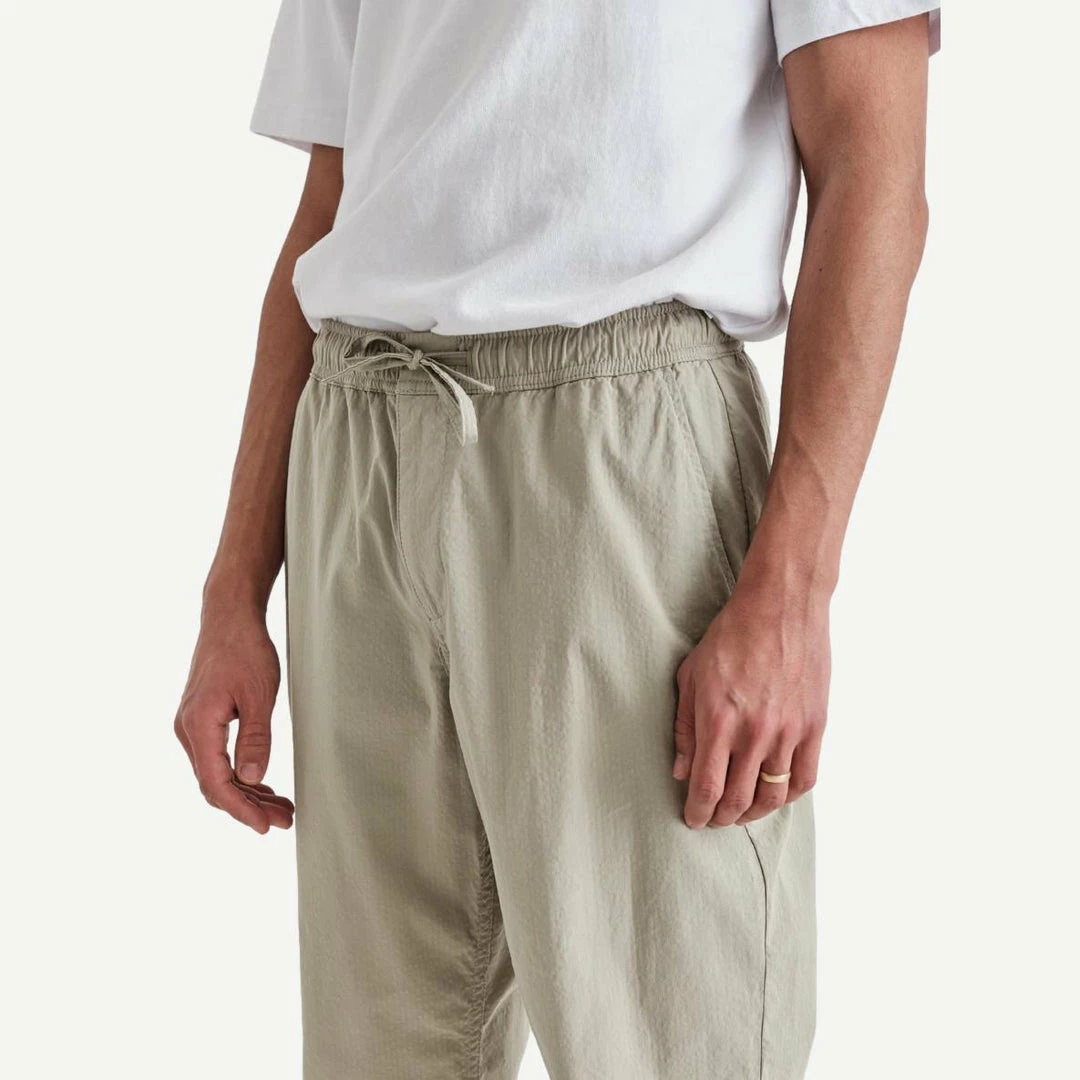 The Kurt is one of Wax’s core signature silhouettes, built with a slightly tapered cropped leg length, featuring an elasticated drawstring for comfort and a concealed front opening zip. Seen here in seersucker, a lightweight breezy fabric perfect for long summer days.